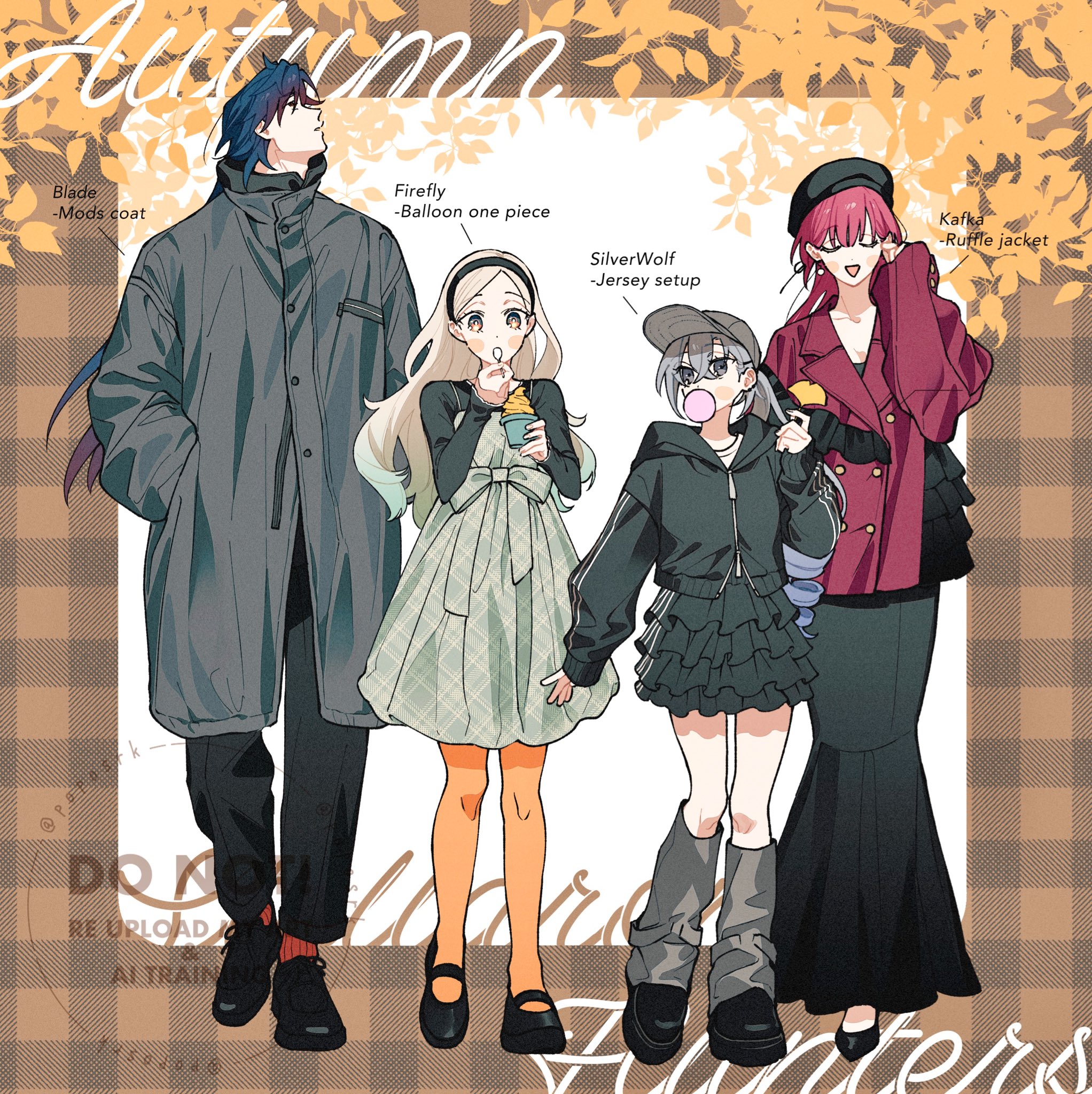 1boy 3girls black_dress black_hat black_shoes black_skirt blade_(honkai:_star_rail) blowing_bubble_gum chewing_gum commentary_request dress dress_ribbon firefly_(honkai:_star_rail) food hat highres honkai:_star_rail honkai_(series) ice_cream jacket kafka_(honkai:_star_rail) multiple_girls open_mouth orange_pantyhose pantyhose purple_jacket shoes silver_wolf_(honkai:_star_rail) skirt smile sorako_(yoshida_t) track_suit watermark