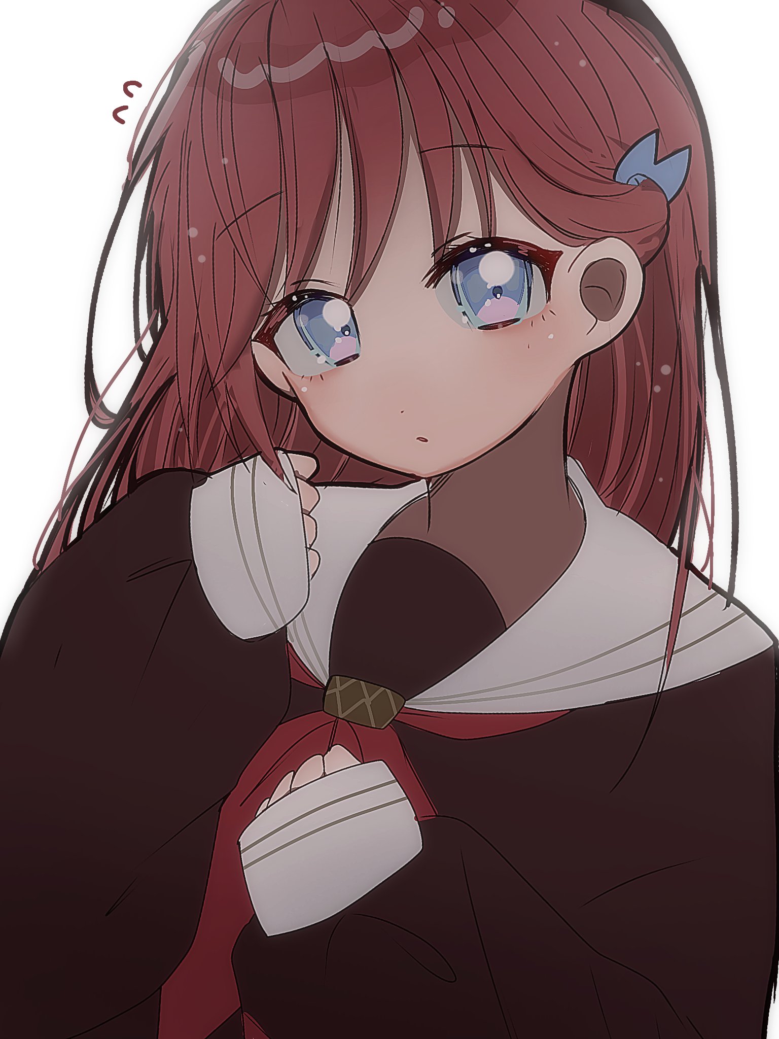 1girl blue_eyes brown_dress col_person commentary_request dress flying_sweatdrops hair_ornament hasu_no_sora_school_uniform highres kinjou_maika link!_like!_love_live! long_hair long_sleeves looking_at_viewer love_live! neckerchief parted_lips red_hair red_neckerchief sailor_collar sailor_dress school_uniform simple_background sleeves_past_wrists solo upper_body white_background white_sailor_collar winter_uniform