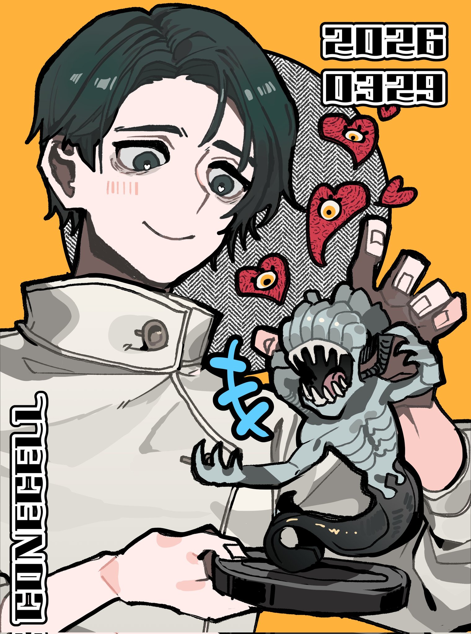 1boy 1other chibi commentary_request cone_cell cursed_spirit_(jujutsu_kaisen) dated heart heart-shaped_pupils highres holding jacket jujutsu_kaisen korean_commentary monster notice_lines okkotsu_yuta orimoto_rika shikigami short_hair signature symbol-shaped_pupils teeth white_jacket yellow_background