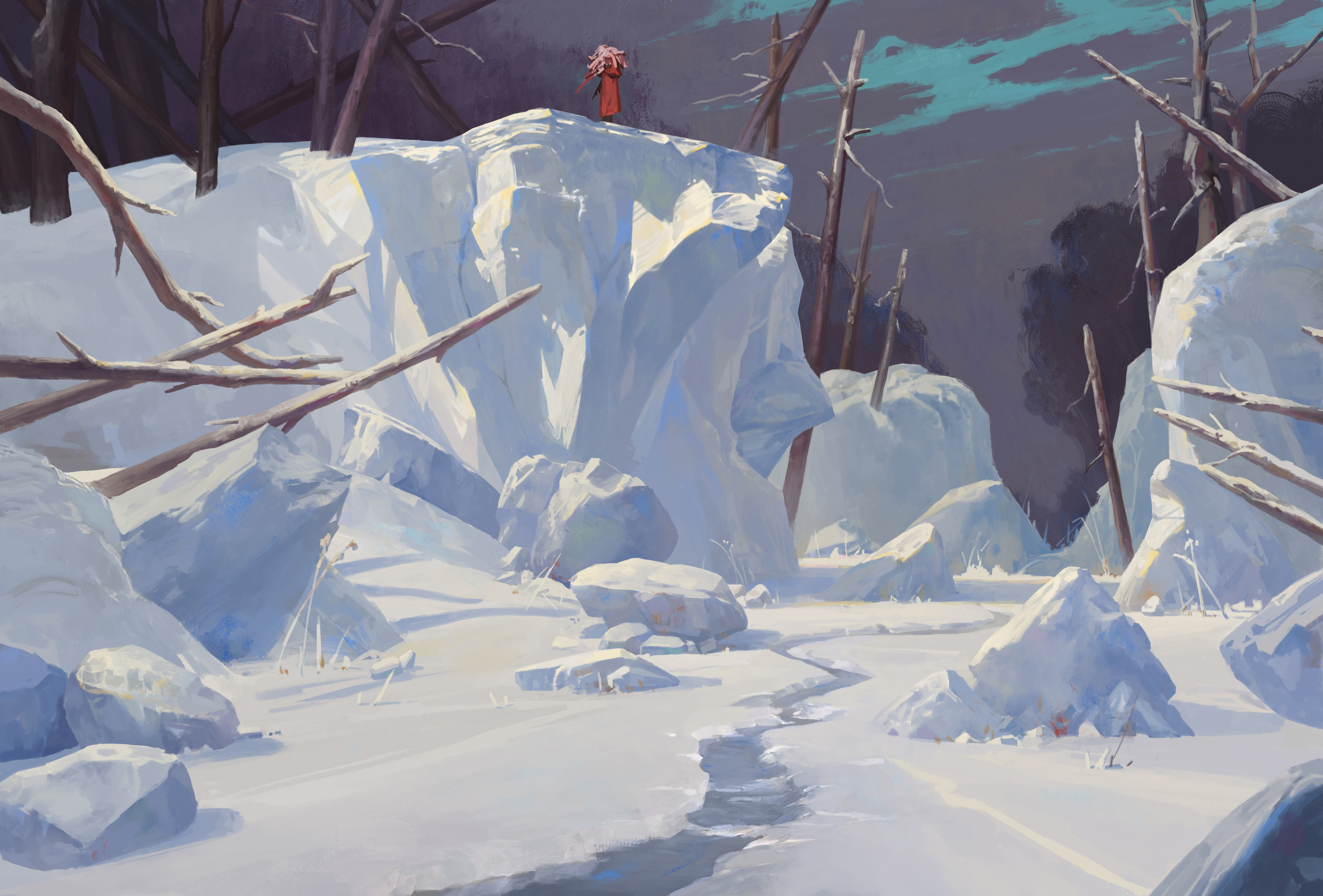 absurdres branch cliff cloud cloudy_sky commentary_request highres ice landscape original outdoors painterly river rock scenery sky stick winter zhongjusun