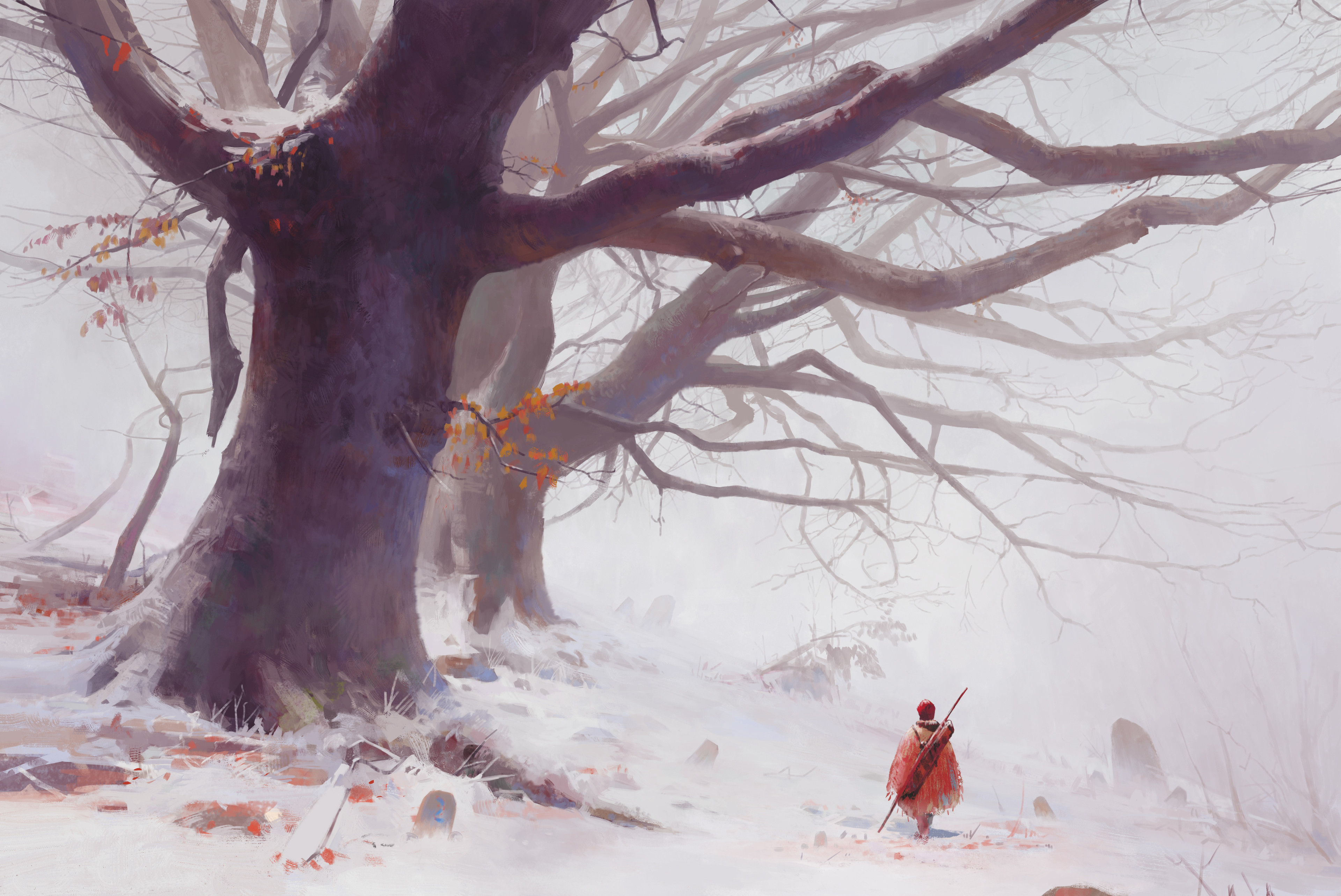 1boy absurdres bare_tree bow_(weapon) branch cloak commentary_request fog from_behind highres landscape original outdoors painterly red_cloak red_hair rock scenery snow standing tree weapon winter yellow_leaf zhongjusun