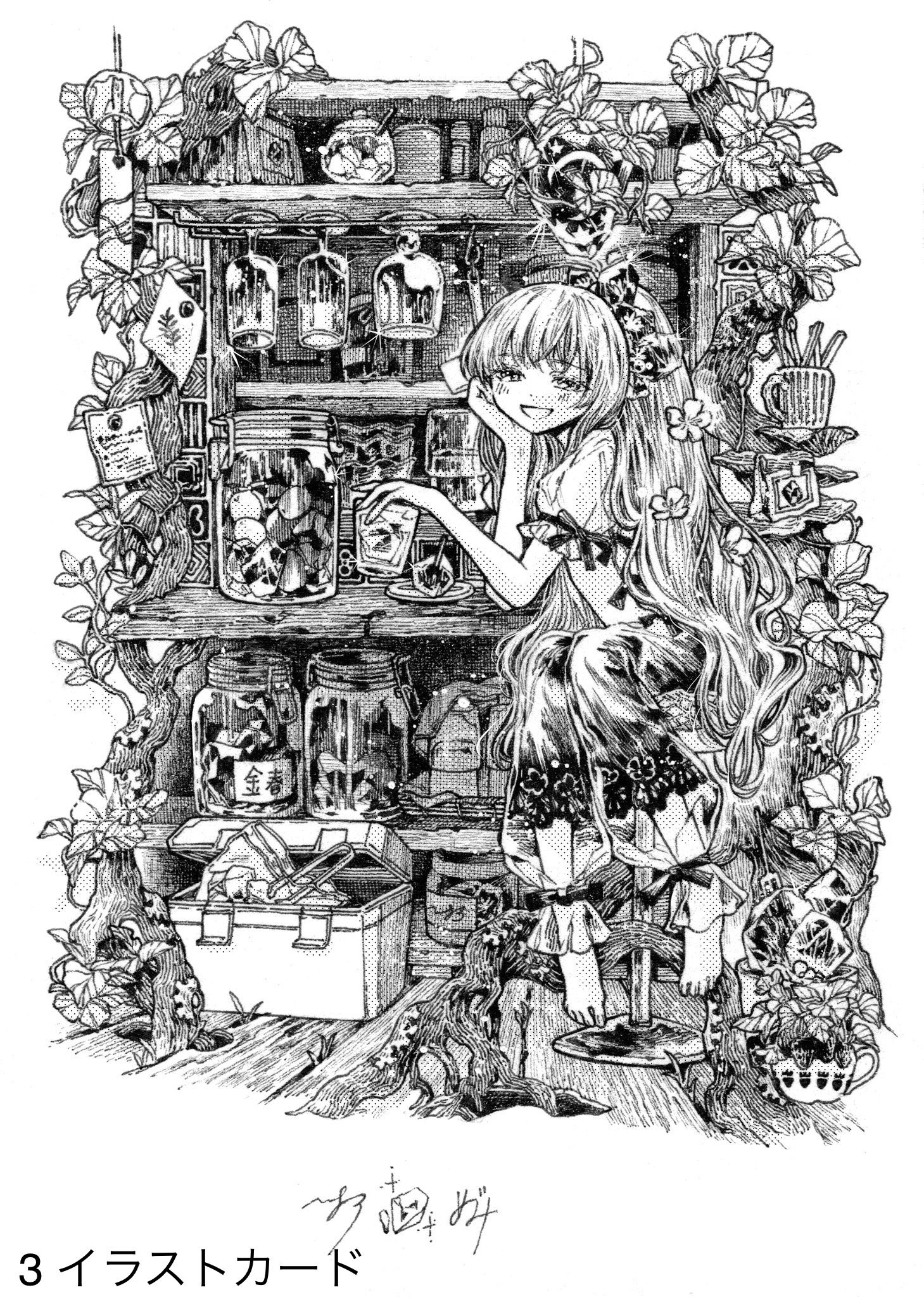 1girl barefoot commentary_request cup drinking_glass full_body greyscale grin hand_on_own_cheek hand_on_own_face hand_rest highres holding holding_cup jar long_hair looking_at_viewer megumi_(mg3) monochrome original pants plant see-through_clothes see-through_pants shelf shirt short_sleeves sitting sleeve_bow smile solo very_long_hair vines