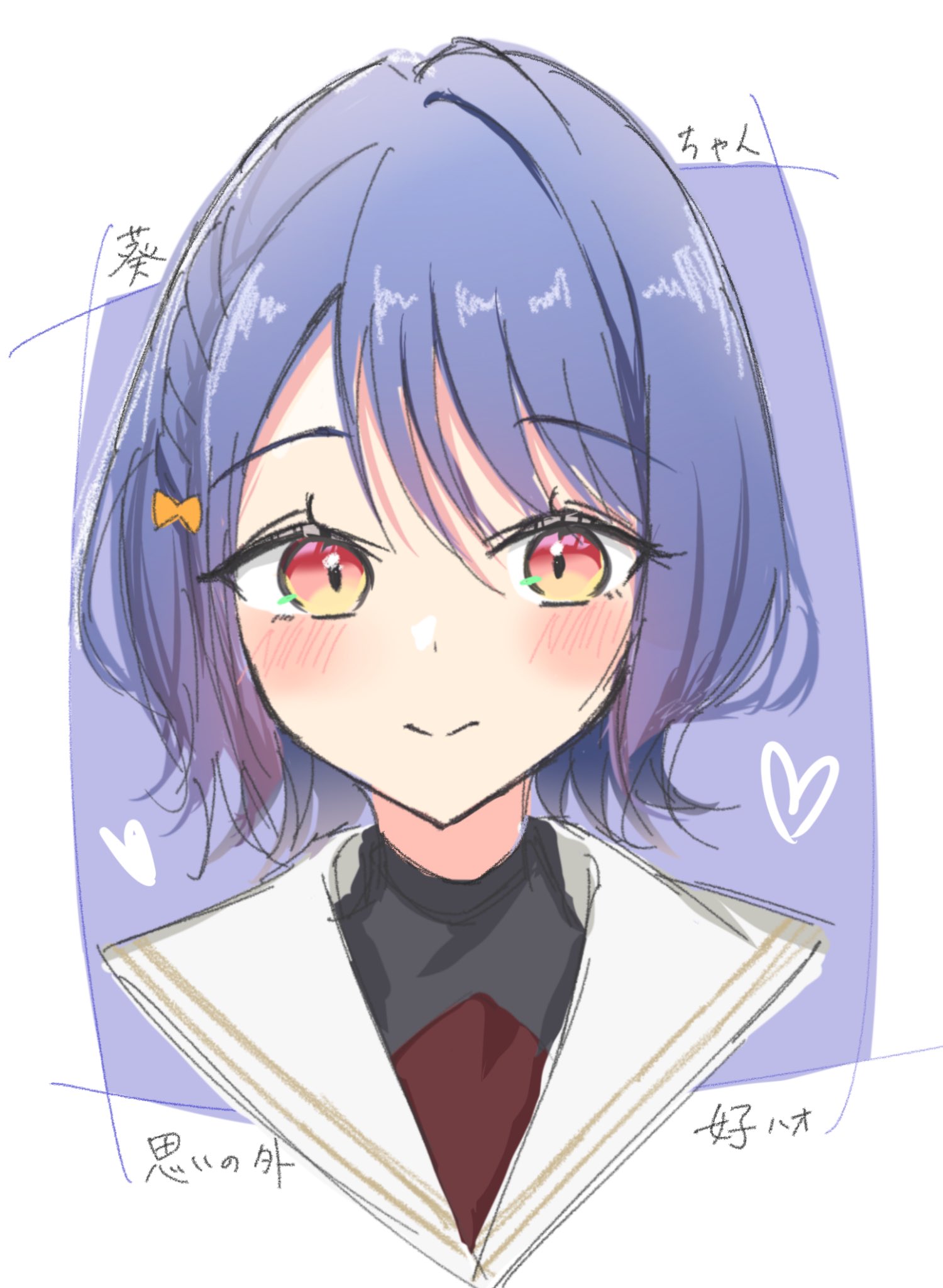 1girl black_shirt blue_eyes blush bow braid hair_bow hasu_no_sora_school_uniform heart highres iroha_(nami3) link!_like!_love_live! love_live! orange_hair reizawa_aoi sailor_collar school_uniform shirt simple_background solo undershirt white_sailor_collar yellow_bow