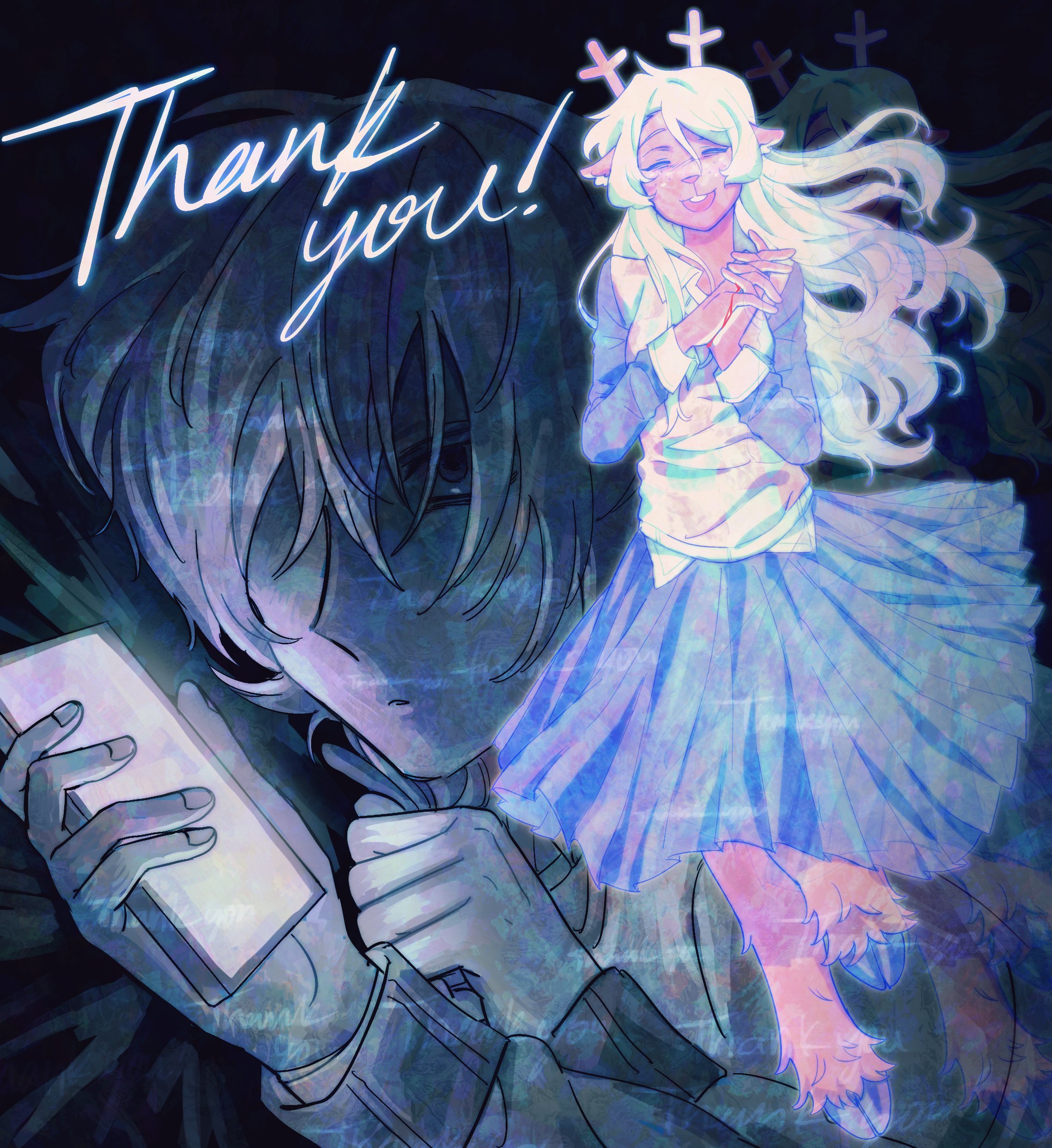 1girl 1other absurdres animal_ears antlers black_skirt blonde_hair blood blood_on_hands cellphone closed_eyes commentary deer_antlers deer_ears deer_girl deltarune english_commentary english_text furry furry_female goomyloid highres holding holding_phone hooves horns kris_(deltarune) noelle_holiday own_hands_together phone skirt smartphone smile thank_you utdr_(toby_fox)