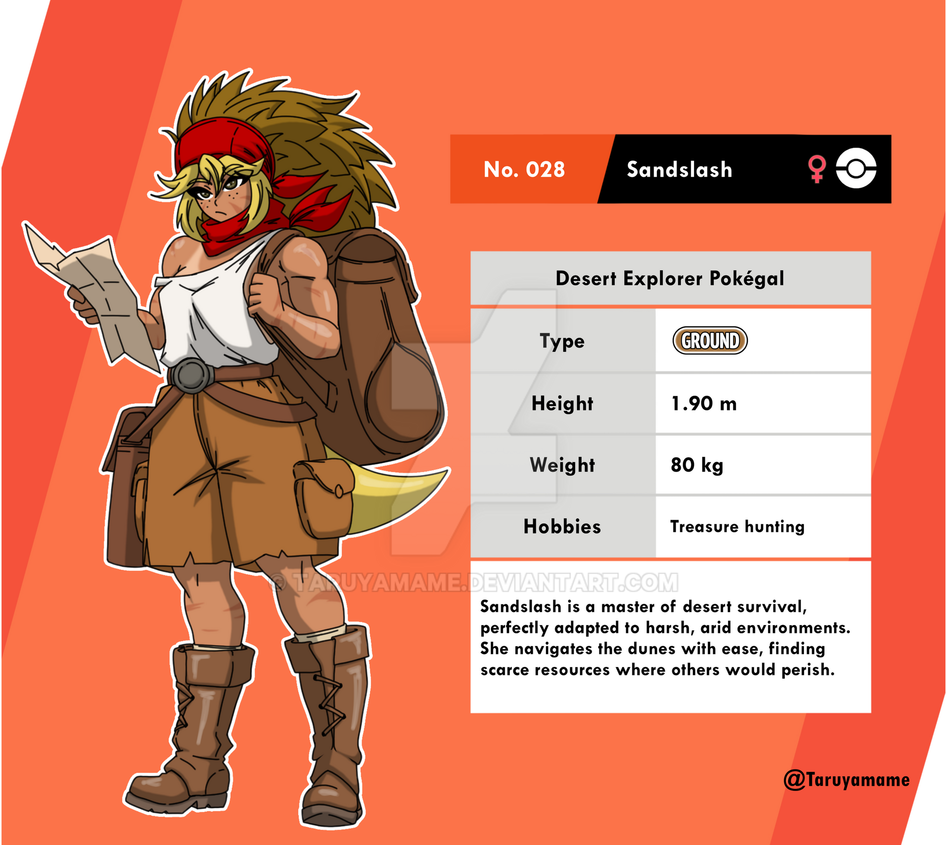 1girl artist_name backpack bag belt blonde_hair boots brown_eyes brown_shorts cargo_pants cargo_shorts character_name character_profile deviantart_logo deviantart_username english_text freckles full_body gen_1_pokemon hair_between_eyes hairband highres holding holding_paper long_hair multicolored_hair neckerchief nintendo pants paper personification pokemon pokemon_sword_and_shield red_neckerchief sandslash scar scar_on_arm scar_on_face scar_on_leg shirt shorts sleeveless sleeveless_shirt strap_slip tan tanline taruyamame toned toned_female white_shirt