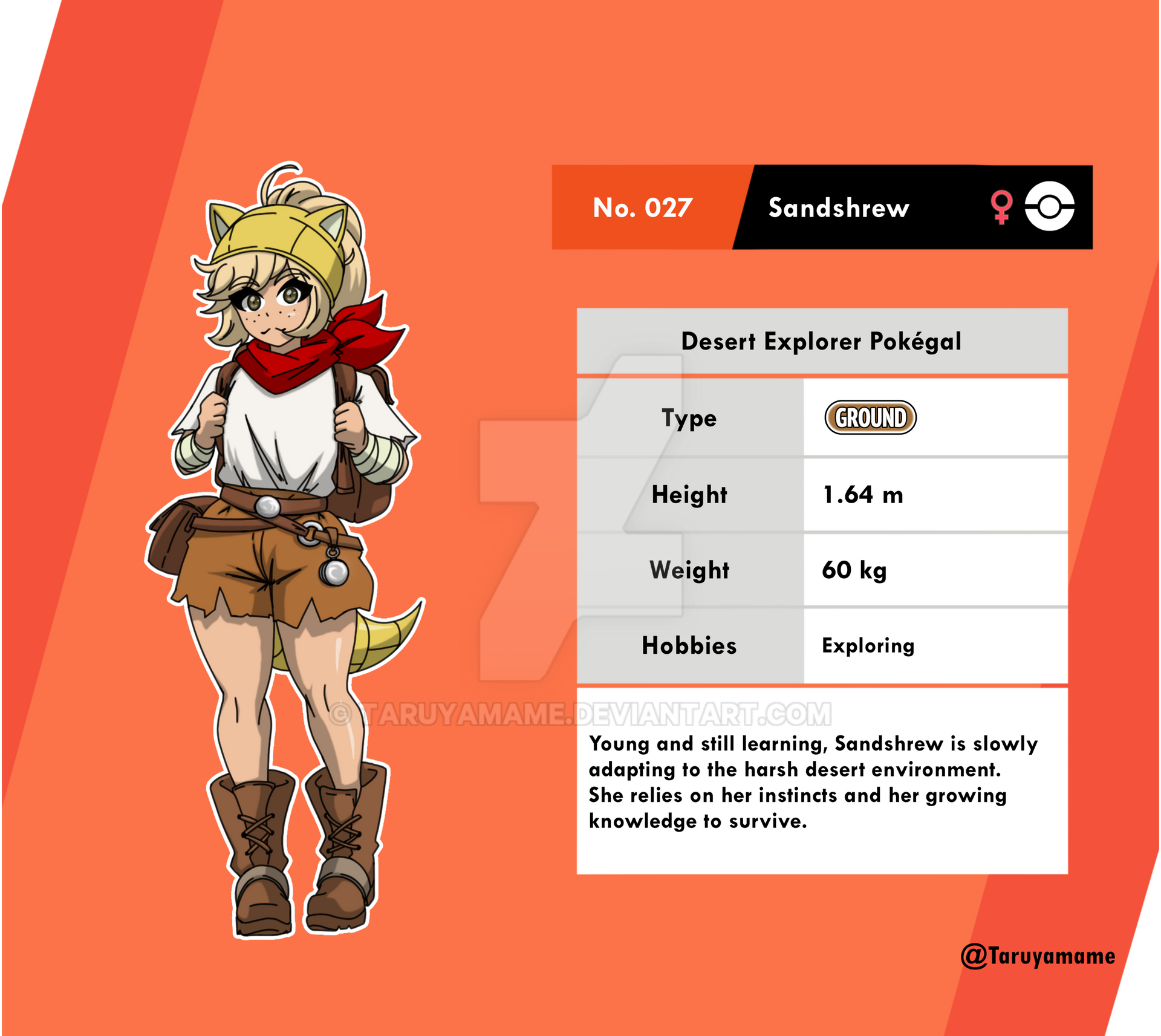 1girl animal_ear_hairband animal_ears backpack bag bandaged_arm bandages belt belt_pouch blonde_hair brown_shorts character_name character_profile deviantart_logo deviantart_username english_text fake_animal_ears freckles full_body gen_1_pokemon hairband height highres looking_at_viewer neckerchief nintendo orange_background personification pokedex_number pokemon pokemon_sword_and_shield ponytail pouch red_neckerchief sandshrew shirt shorts tail taruyamame torn_clothes venus_symbol weight white_shirt