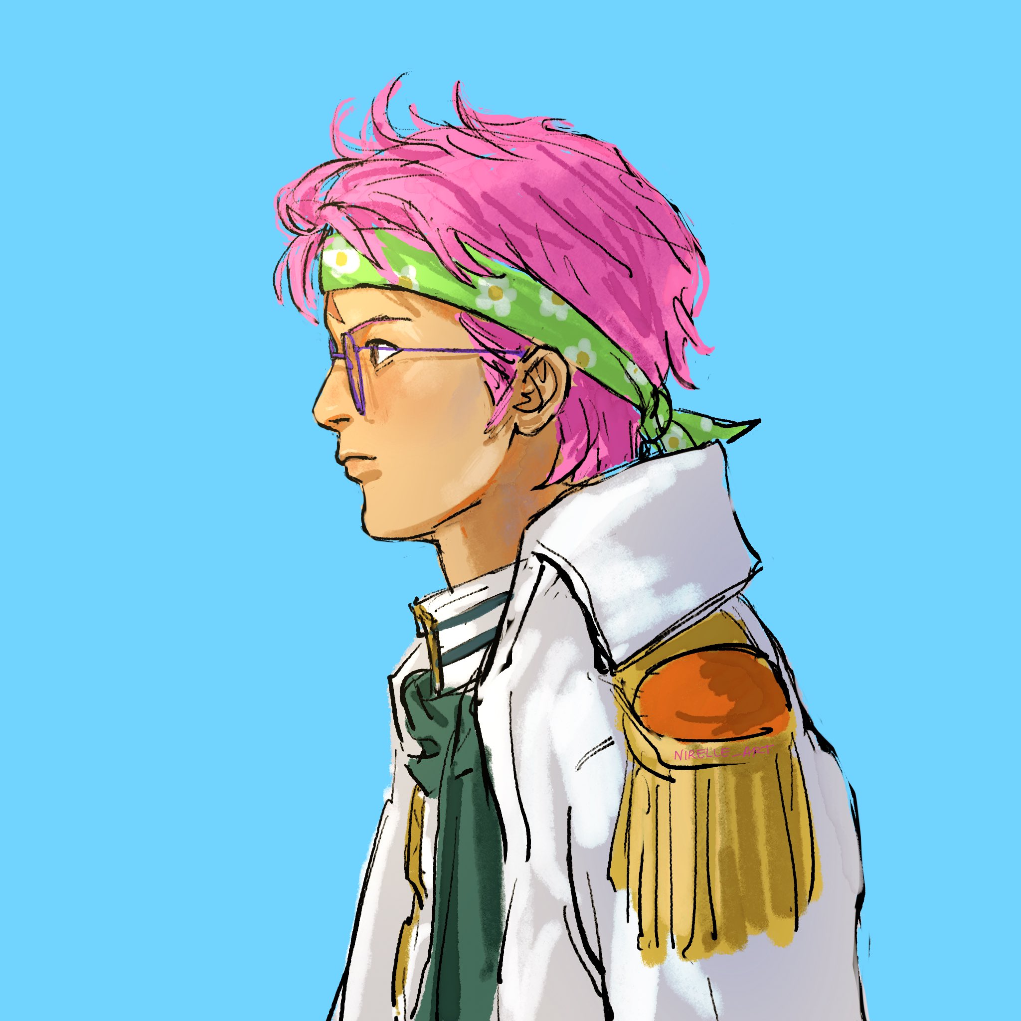 1boy blue_background closed_mouth coat collared_shirt epaulettes glasses green_headband headband highres koby_(one_piece) looking_ahead male_focus neckerchief nirelle_art one_piece pink_hair profile scar scar_on_face scar_on_forehead shirt short_hair sideburns simple_background solo upper_body white_coat