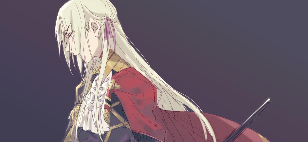 1girl blonde_hair breasts capelet edelgard_von_hresvelg fire_emblem fire_emblem:_three_houses from_side garreg_mach_monastery_uniform hair_ribbon holding holding_weapon korean_commentary long_hair long_sleeves looking_down nintendo parted_bangs purple_background purple_eyes purple_ribbon red_capelet ribbon shade simple_background small_breasts solo standing upper_body vndghktjfdnjf weapon