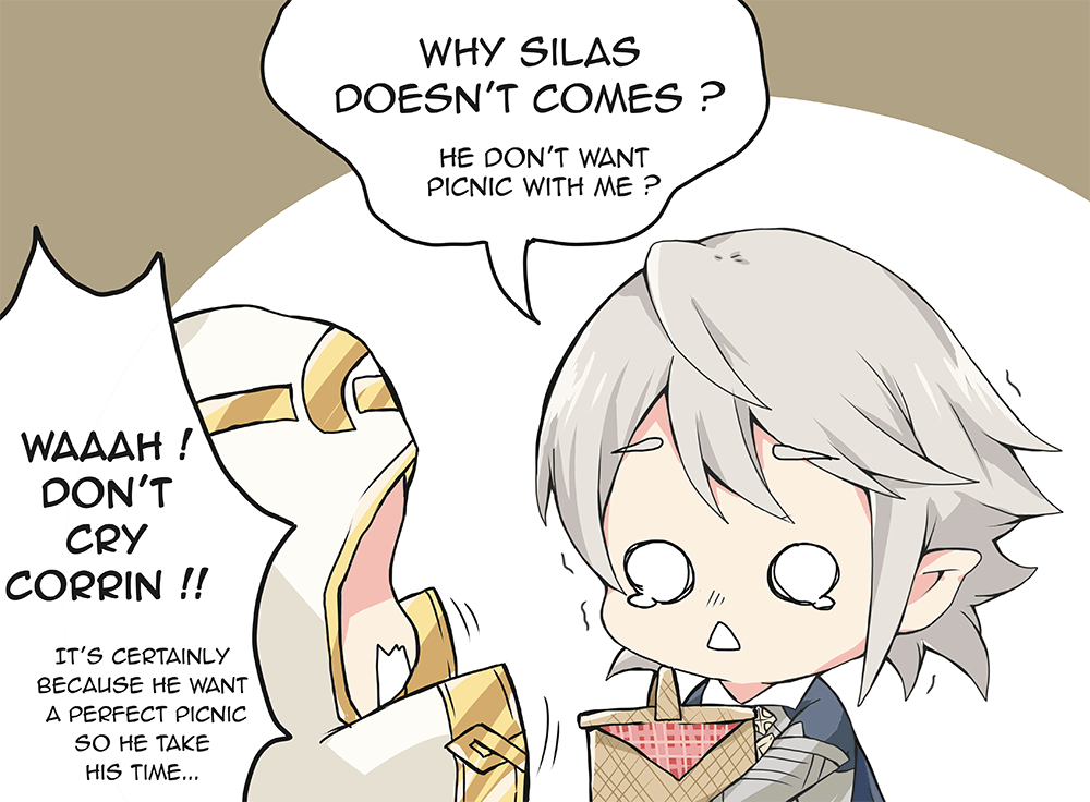 1boy 1other animated animated_gif english_text fire_emblem fire_emblem_fates fire_emblem_heroes happystarring hood hood_up hooded_robe kiran_(fire_emblem) male_corrin_(fire_emblem) male_focus nintendo picnic_basket pointy_ears robe speech_bubble white_robe