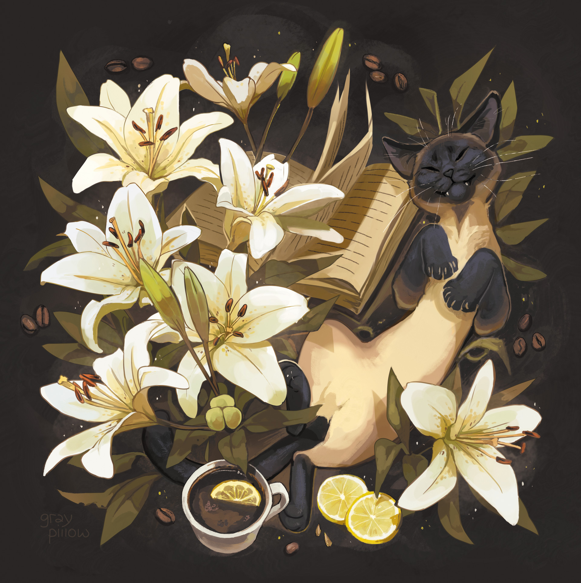 animal animal_focus book cat closed_eyes coffee coffee_beans colorpoint_(pattern) commentary cup english_commentary fangs flower food fruit graypillow highres leaf lemon lemon_slice lily_(flower) lying mug no_humans on_back original siamese_cat solo whiskers white_flower