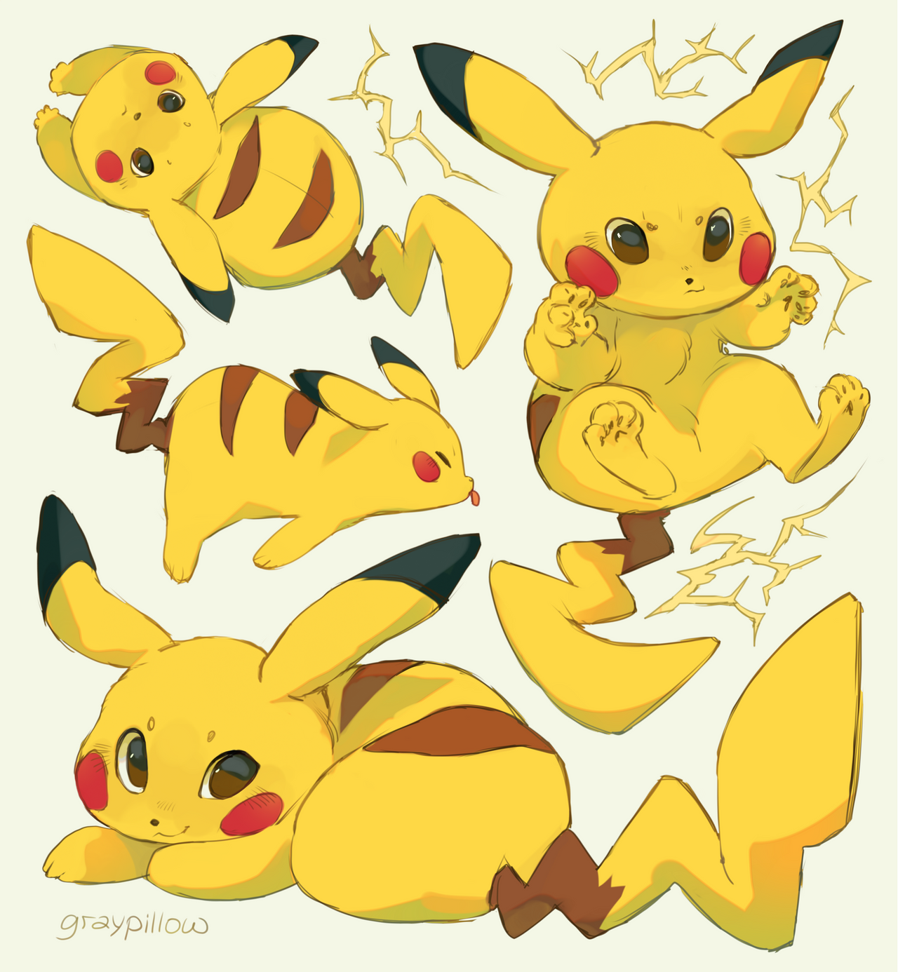 :3 animal_focus brown_eyes claws closed_eyes commentary electricity english_commentary gen_1_pokemon graypillow highres looking_at_viewer multiple_views nintendo no_humans pikachu pokemon pokemon_(creature) pokemon_focus simple_background sitting tongue tongue_out