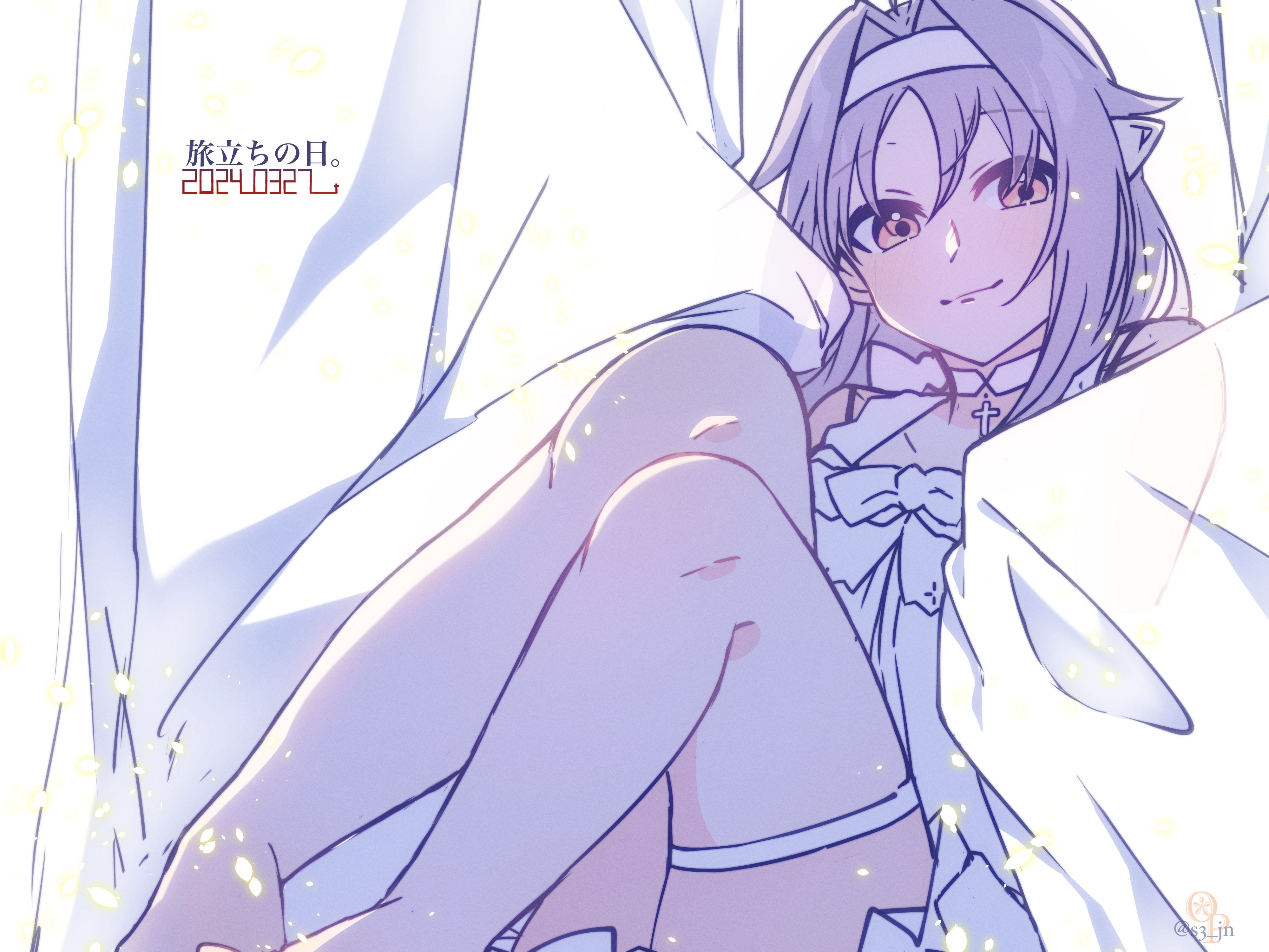 1girl absurdres alternate_costume commentary_request cross dated dress highres light_blush light_smile long_hair long_sidelocks looking_at_viewer low_neckline neosight pink_eyes pointy_ears purple_hair short_dress sidelocks solo sword_art_online thighhighs translation_request white_dress white_thighhighs yuuki_(sao)
