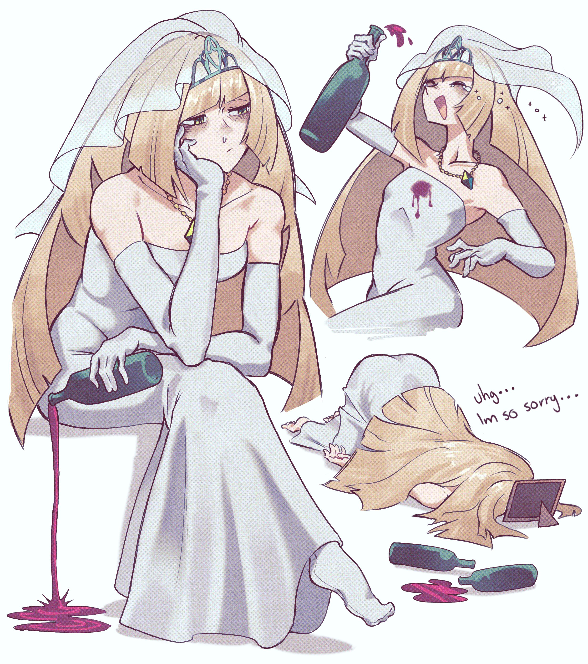 1girl absurdres alcohol andrich_galam bags_under_eyes blonde_hair bridal_veil crying dress gloves green_eyes highres jewelry lusamine_(pokemon) lying mature_female necklace nintendo pokemon pokemon_sun_and_moon runny_nose simple_background sitting snot stain tears tiara veil wedding_dress white_background white_gloves