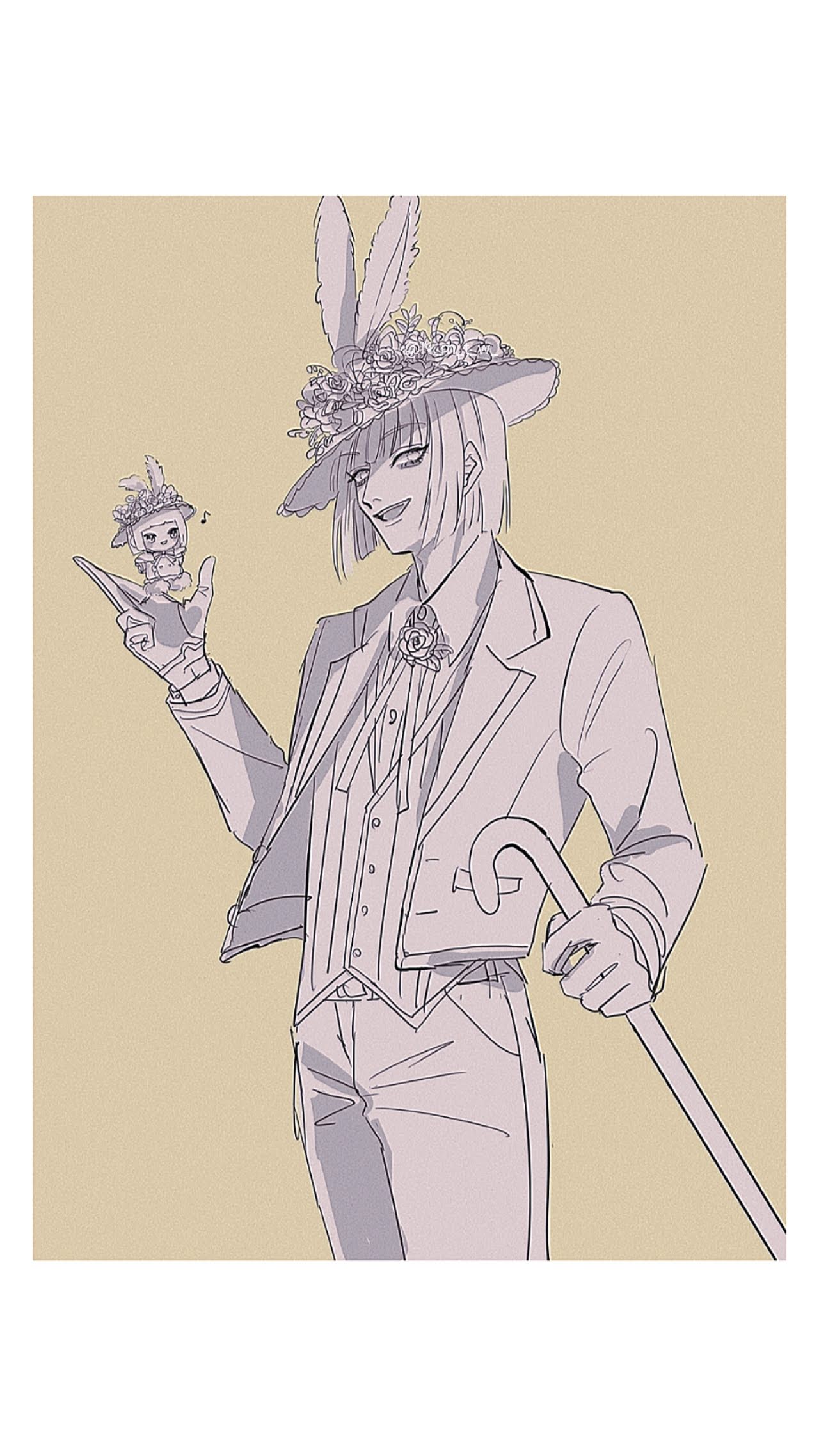1boy animal_ears bob_cut cane character_doll doll formal_clothes gloves hat highres holding holding_cane holding_stuffed_toy jacket long_sleeves looking_at_viewer male_focus ntmn_nmtw open_clothes open_jacket queendom_of_roses'_white_rabbit_fes rabbit_ear_hat rabbit_ears ribbon rook_hunt sepia shirt short_hair simple_background smile solo stuffed_animal stuffed_toy suit twisted_wonderland white_background