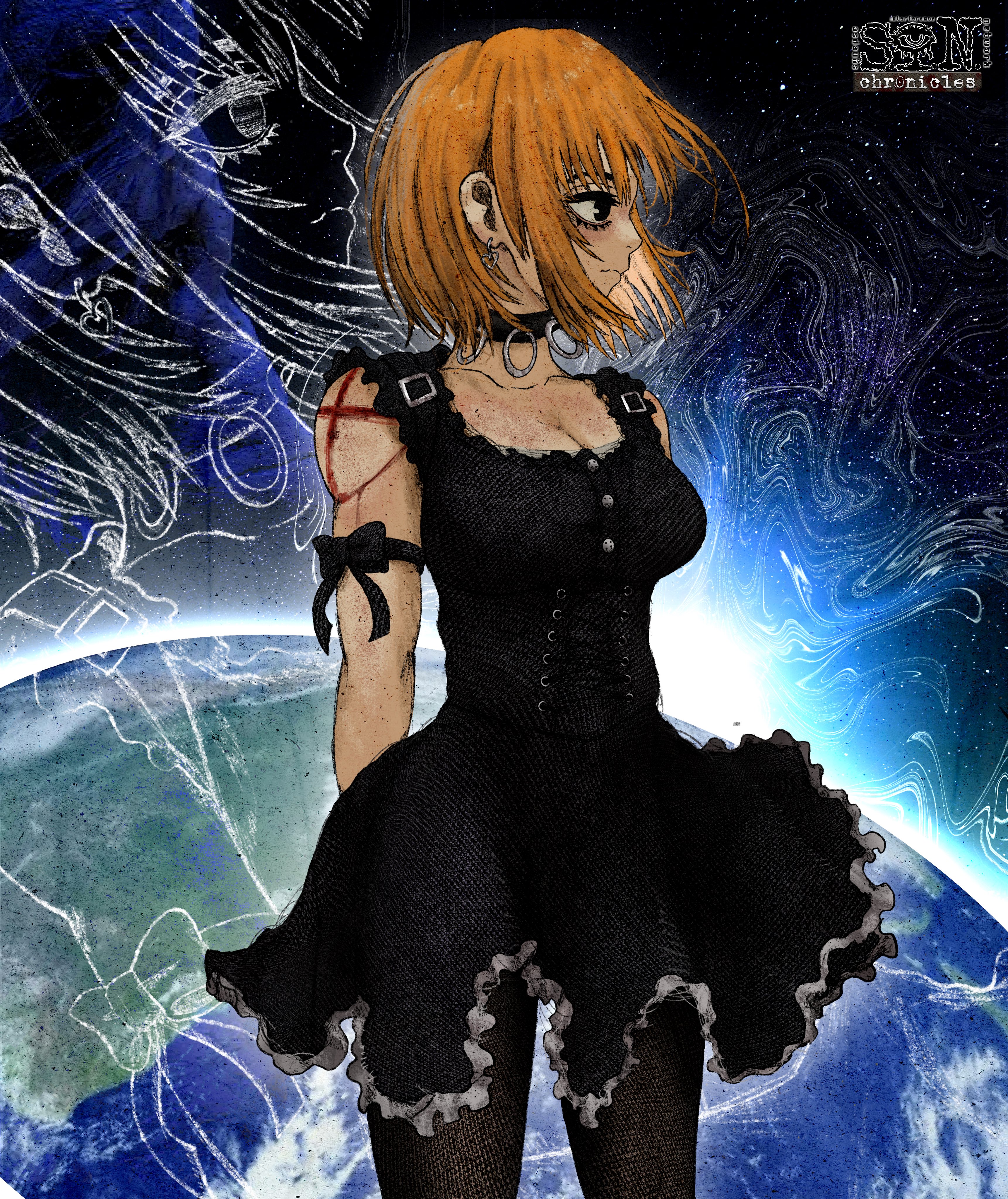 1girl absurdres arm_ribbon arm_tattoo bare_shoulders black_collar black_corset black_dress black_eyes black_ribbon breasts buttons cleavage closed_mouth collar collarbone copyright_logo corset dress earrings earth_(planet) elara_(s.i.n:_chronicles) fishnet_pantyhose fishnets frilled_dress frills from_side heart heart_earrings hedprotag highres jewelry large_breasts logo looking_ahead official_art orange_hair pantyhose planet ribbon s.i.n:_chronicles short_hair sleeveless sleeveless_dress solo space star_(sky) tattoo zoom_layer
