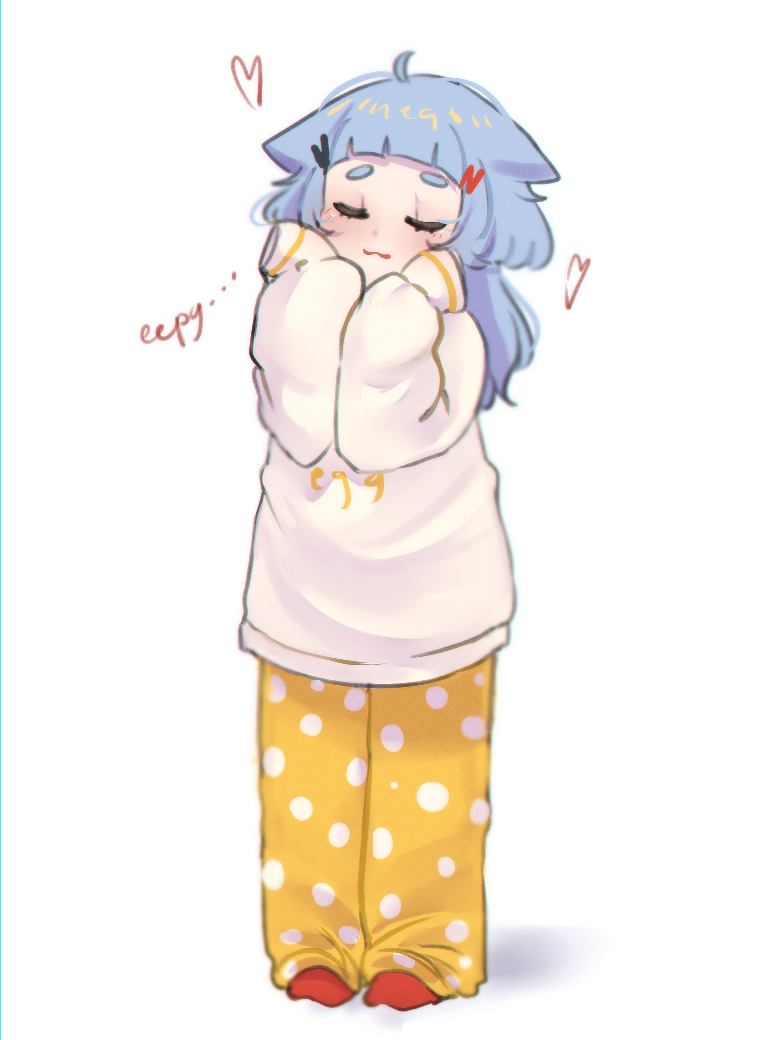 1girl :3 absurdres ahoge blue_hair closed_eyes highres long_sleeves neqo_(character) neqo_(neneneqo) original oversized_clothes pajamas polka_dot polka_dot_pajamas polka_dot_pants solo standing white_background yellow_pajamas