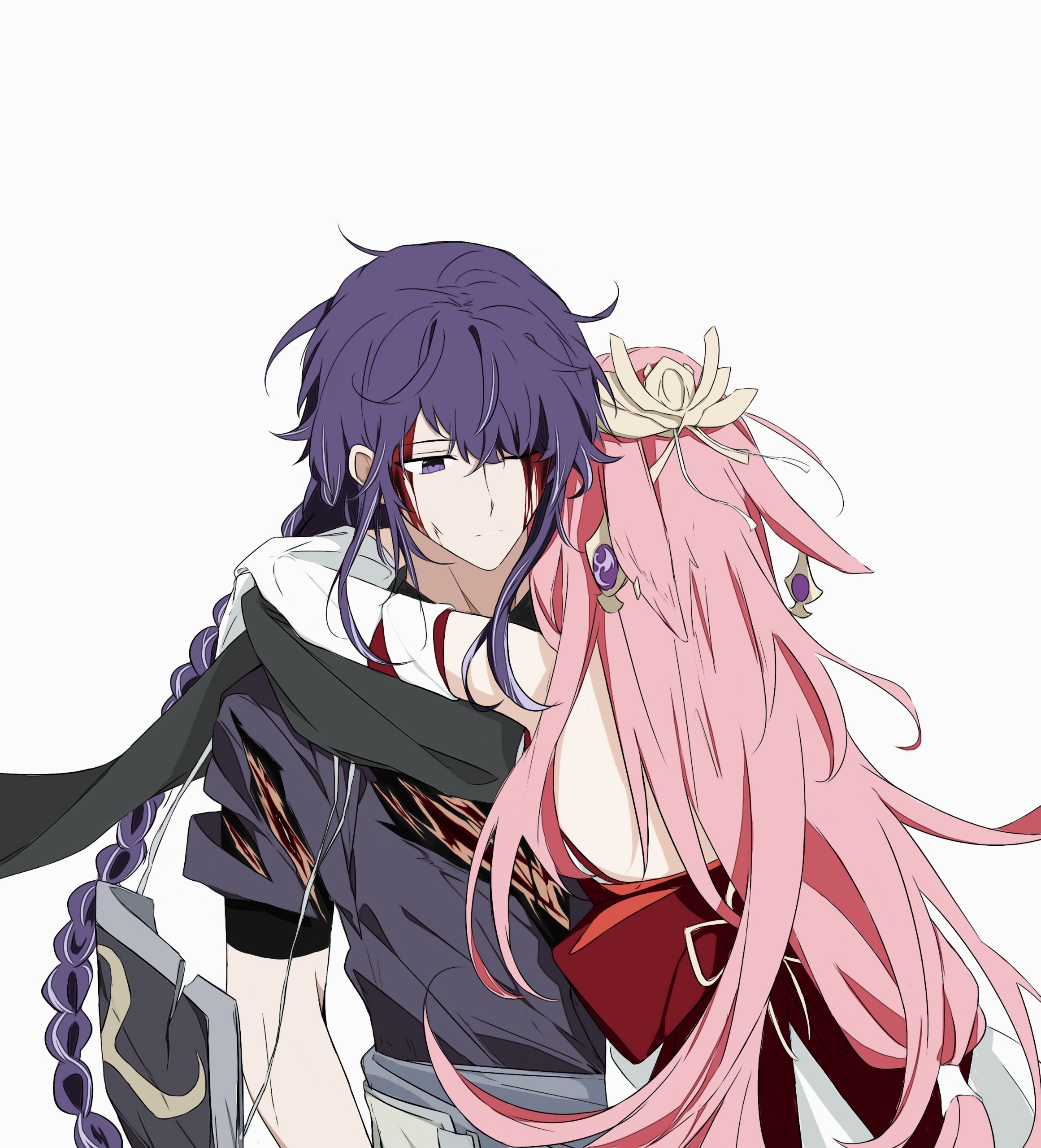1boy 1girl absurdres alternate_costume alternate_universe animal_ear_piercing animal_ears blood blood_on_face blunt_bangs braid chinese_commentary couple cuts echomouse fox_ears fox_tail from_behind genderswap genderswap_(ftm) genshin_impact hair_ornament headpiece hetero highres hug injury japanese_clothes leaning_forward leaning_to_the_side long_hair looking_down messy_hair mole mole_under_eye multicolored_hair muscular muscular_male one_eye_closed parted_lips pink_hair purple_eyes purple_hair raiden_shogun short_sleeves simple_background single_braid sketch streaked_hair tail torn_clothes upper_body white_background yae_miko