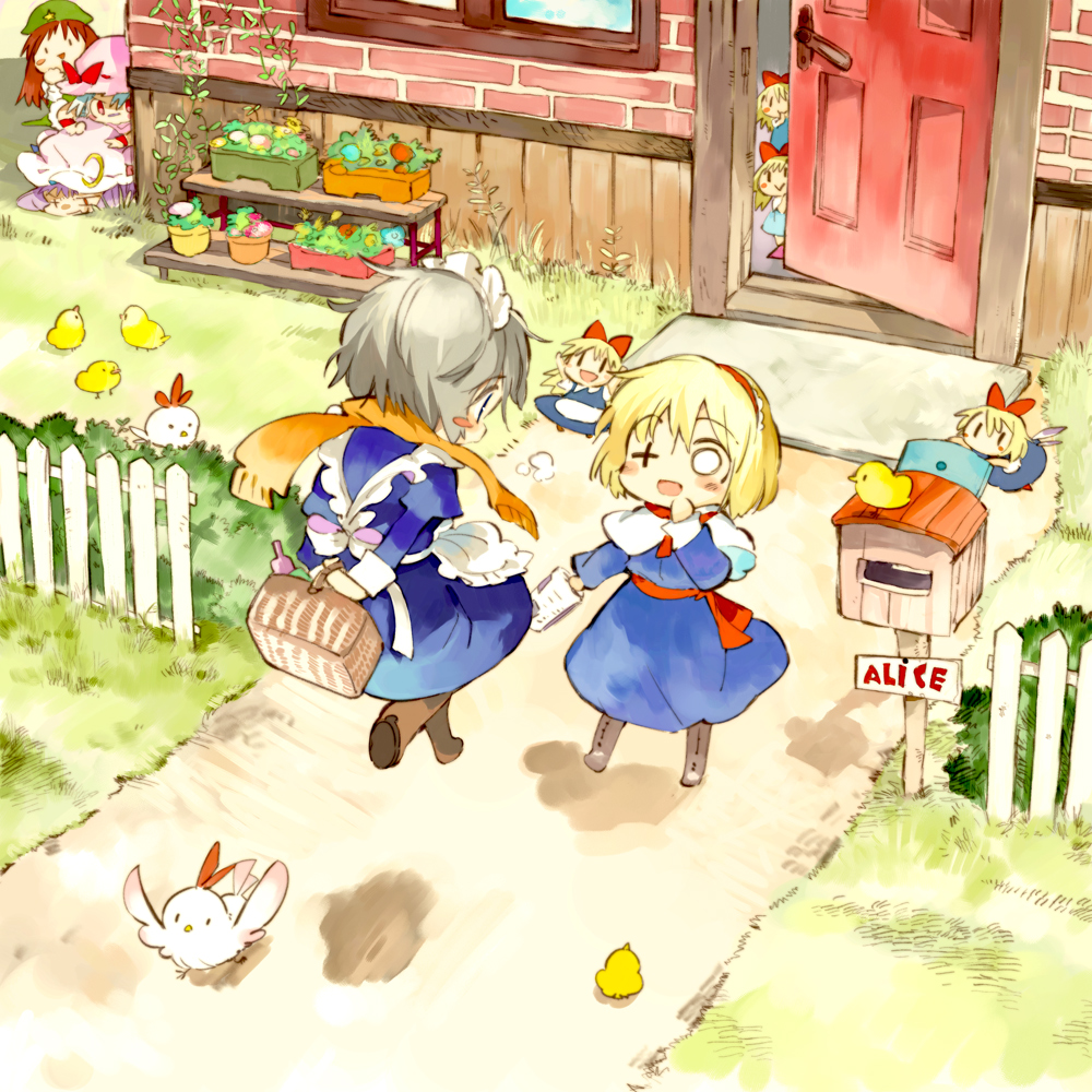 +_+ 5girls :> :d aged_down alice_margatroid animal apron arms_behind_back baby_animal basket bird blonde_hair blue_dress boots building capelet chibi chick chicken child doll dress facepaint female_focus fence flower flying garden grey_hair hairband hand_to_own_mouth hat hiding hong_meiling house izayoi_sakuya long_hair lying maid maid_apron maid_headdress mailbox multiple_girls newspaper ogawa_maiko on_head on_stomach open_mouth patchouli_knowledge path peeking person_on_head remilia_scarlet road shanghai_doll short_hair smile touhou white_eyes |_|