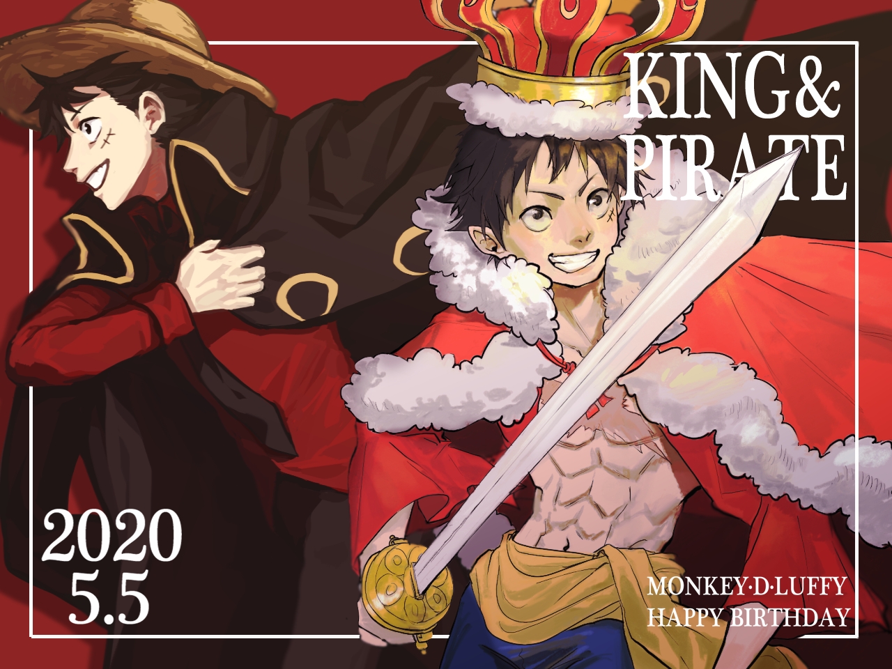 1boy abs black_coat black_hair black_necktie character_name clenched_teeth coat collared_coat commentary_request crown dated happy_birthday holding holding_sword holding_weapon masukawagen monkey_d._luffy multiple_views necktie one_piece one_piece:_strong_world red_background sash scar scar_on_chest scar_on_face shadow short_hair simple_background smile sword teeth weapon yellow_sash