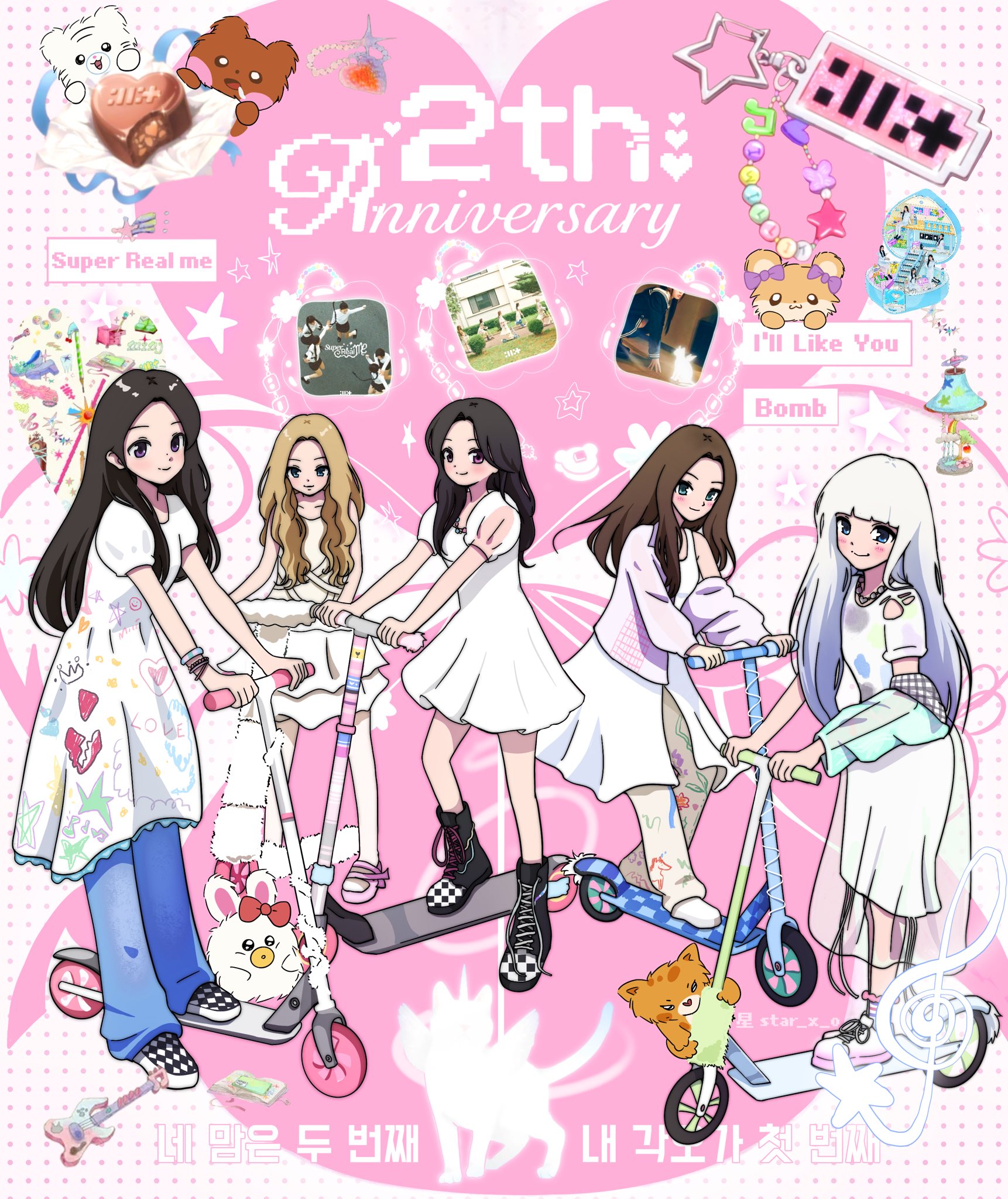 album_cover animification anniversary black_boots blue_eyes blue_pants blunt_bangs boots bow brown_eyes candy chocolate chocolate_heart cover dress everyone food fox green_eyes guitar hamster heart heart-shaped_food highres illit instrument iroha_(illit) k-pop kick_scooter korean_text lamp looking_at_viewer minju_(illit) moka_(illit) pants pink_eyes pink_shoes pink_socks purple_bow real_life shoes smile socks white_dress white_hair white_shoes wonhee_(illit) xing_(star_x_o) yunah_(illit)