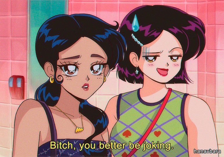 2girls animification artist_name blue_hair blush brown_eyes commentary earrings english_text euphoria_(2019) hanavbara jewelry kat_hernandez long_eyelashes madeleine_perez multiple_girls necklace ponytail purple_hair shirt sleeveless sleeveless_shirt sweatdrop