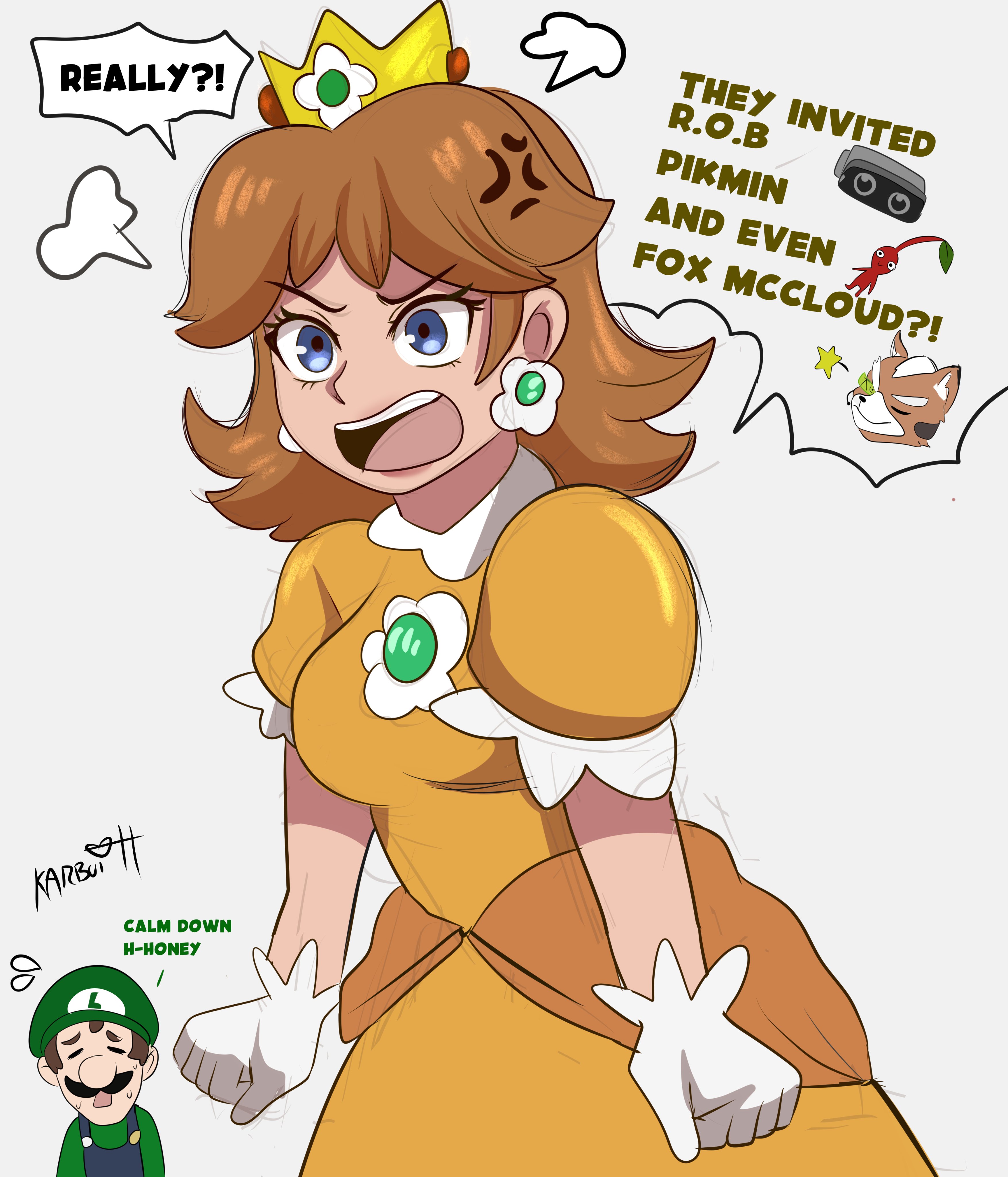 1girl 2boys 2others absurdres anger_vein angry blue_eyes blue_overalls brooch brown_hair chibi chibi_inset crown dress earrings facial_hair family_computer_robot flipped_hair flower_brooch flower_earrings fox_mccloud frilled_gloves frills furry furry_male gloves gold_crown gown green_hat green_shirt hat highres jewelry karbuitt luigi mario_(series) medium_hair multiple_boys multiple_others mustache nintendo non-humanoid_robot orange_dress overalls pikmin_(creature) pikmin_(series) pointed_crown princess_daisy puffy_short_sleeves puffy_sleeves robot shirt short_sleeves solo_focus star_fox the_super_mario_galaxy_movie v-shaped_eyebrows white_gloves yellow_dress