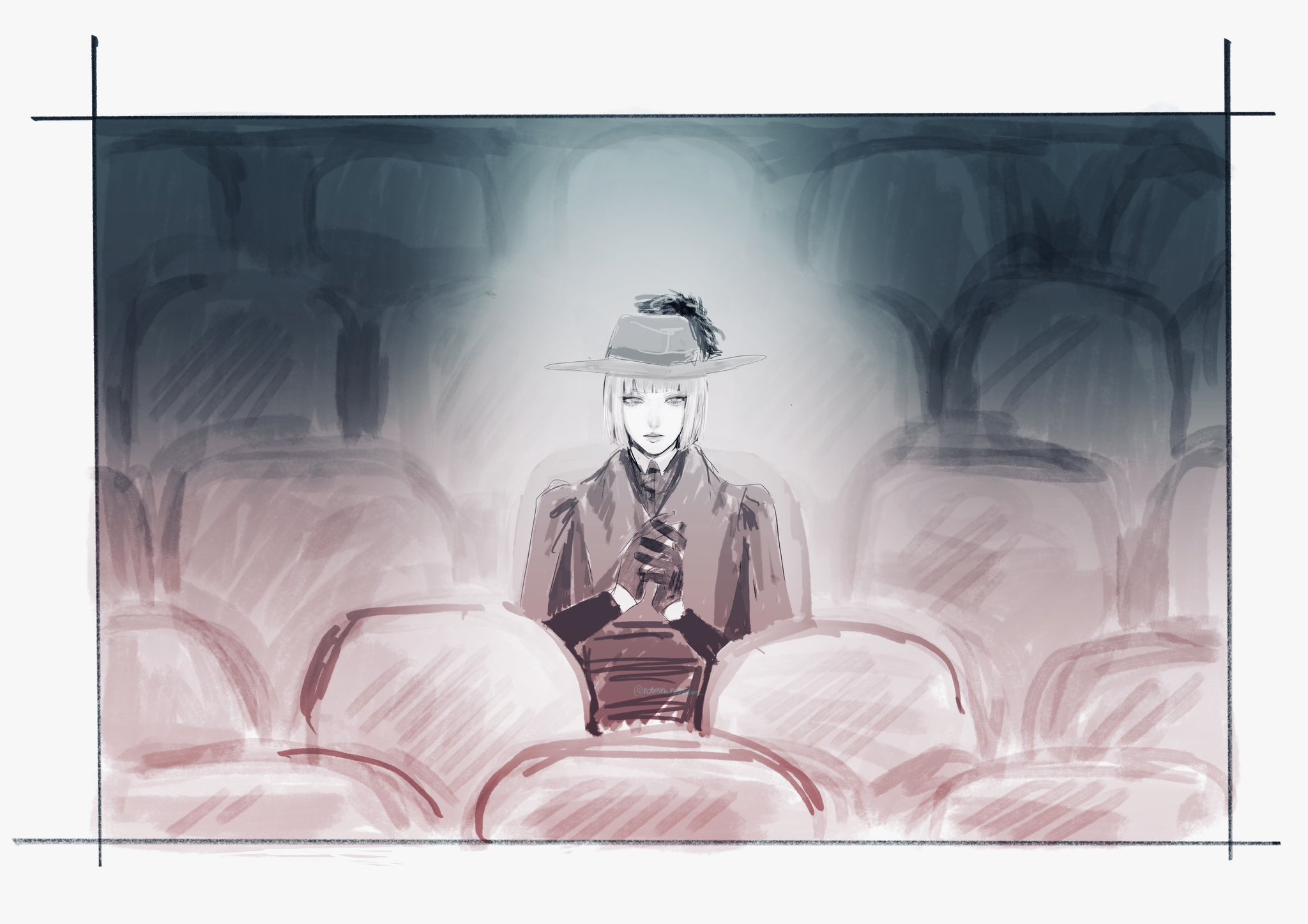 1boy bob_cut chair clapping gloves hat_feather highres long_sleeves male_focus ntmn_nmtw on_chair pomefiore_dorm_uniform rook_hunt short_hair sitting spotlight theater theater_seating twisted_wonderland