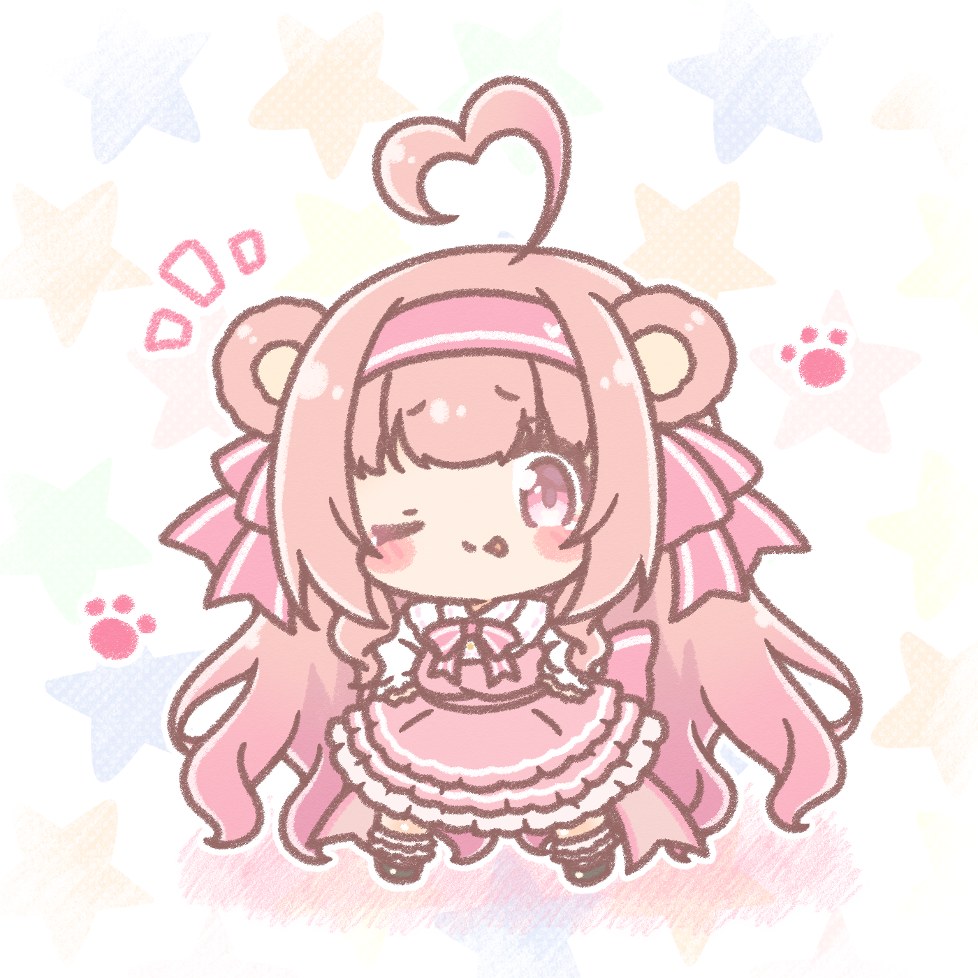 1girl ;p ahoge animal_ears bear_ears chibi closed_mouth colored_shadow dress hairband hands_on_own_hips heart heart_ahoge highres hiiro_kuma indie_virtual_youtuber long_hair long_sleeves looking_at_viewer mitarashi_neko notice_lines one_eye_closed pink_dress pink_hair pink_hairband puffy_long_sleeves puffy_sleeves shadow shirt sleeves_past_wrists smile solo standing star_(symbol) tongue tongue_out very_long_hair virtual_youtuber white_background white_shirt