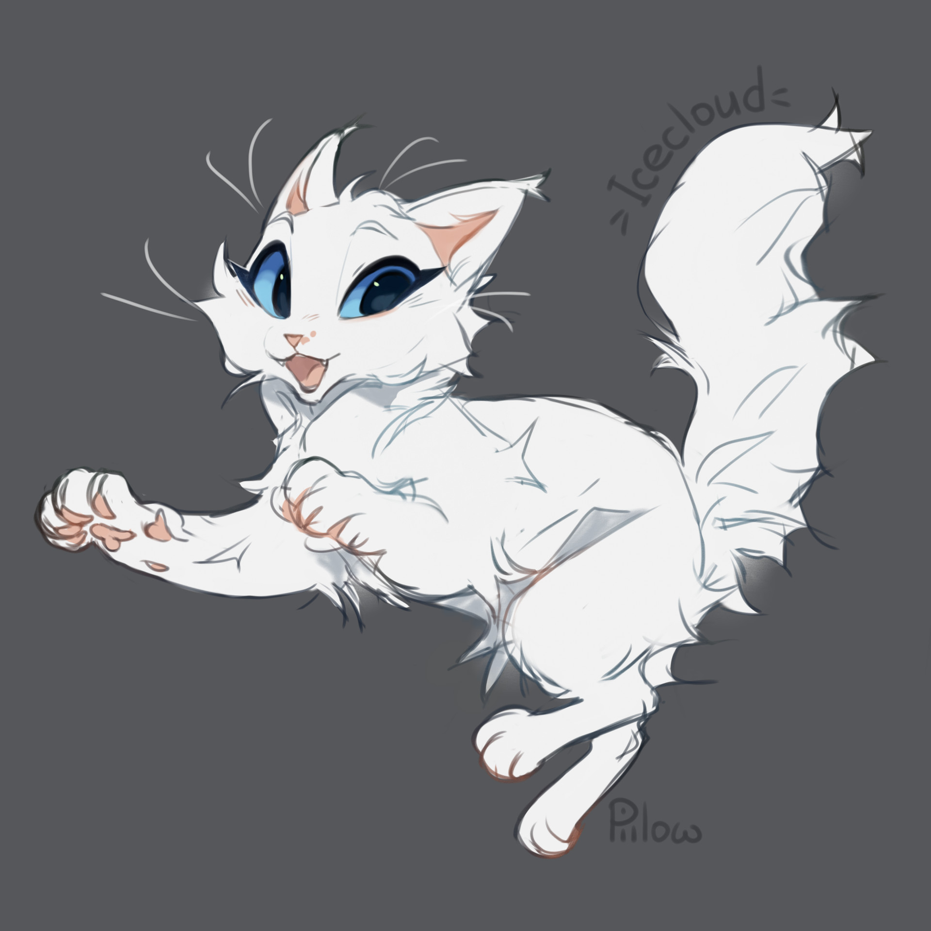 :3 :d animal animal_focus artist_name blue_eyes cat character_name commentary english_commentary fluffy full_body graypillow grey_background highres icecloud jumping looking_at_viewer no_humans open_mouth pawpads power_of_three simple_background smile solo tachi-e warrior_cats whiskers white_cat