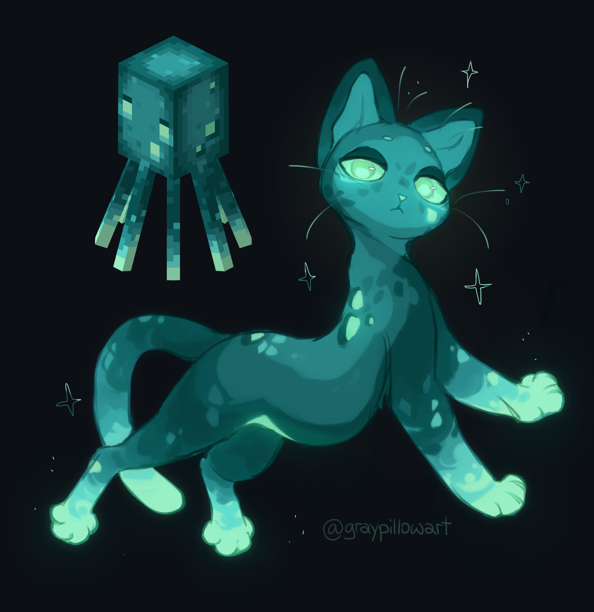 alternate_species animal animal_focus aqua_eyes artist_name black_background cat colored_extremities commentary english_commentary full_body glow_squid glowing graypillow highres looking_at_viewer minecraft no_humans reference_inset simple_background solo sparkle whiskers