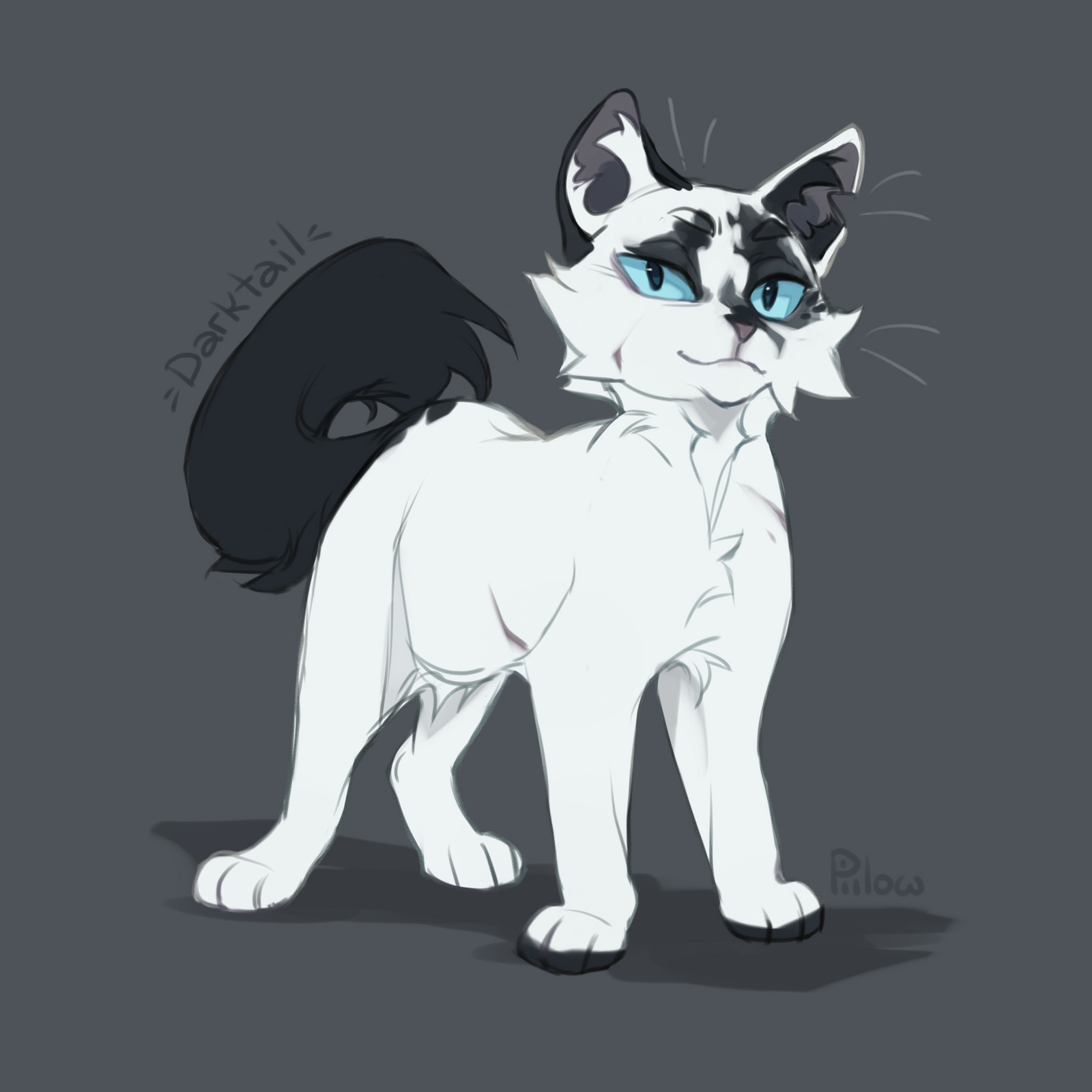 :3 a_vision_of_shadows animal animal_focus artist_name blue_eyes cat character_name commentary darktail english_commentary fluffy full_body graypillow grey_background highres looking_at_viewer no_humans simple_background solo standing tachi-e warrior_cats whiskers white_cat