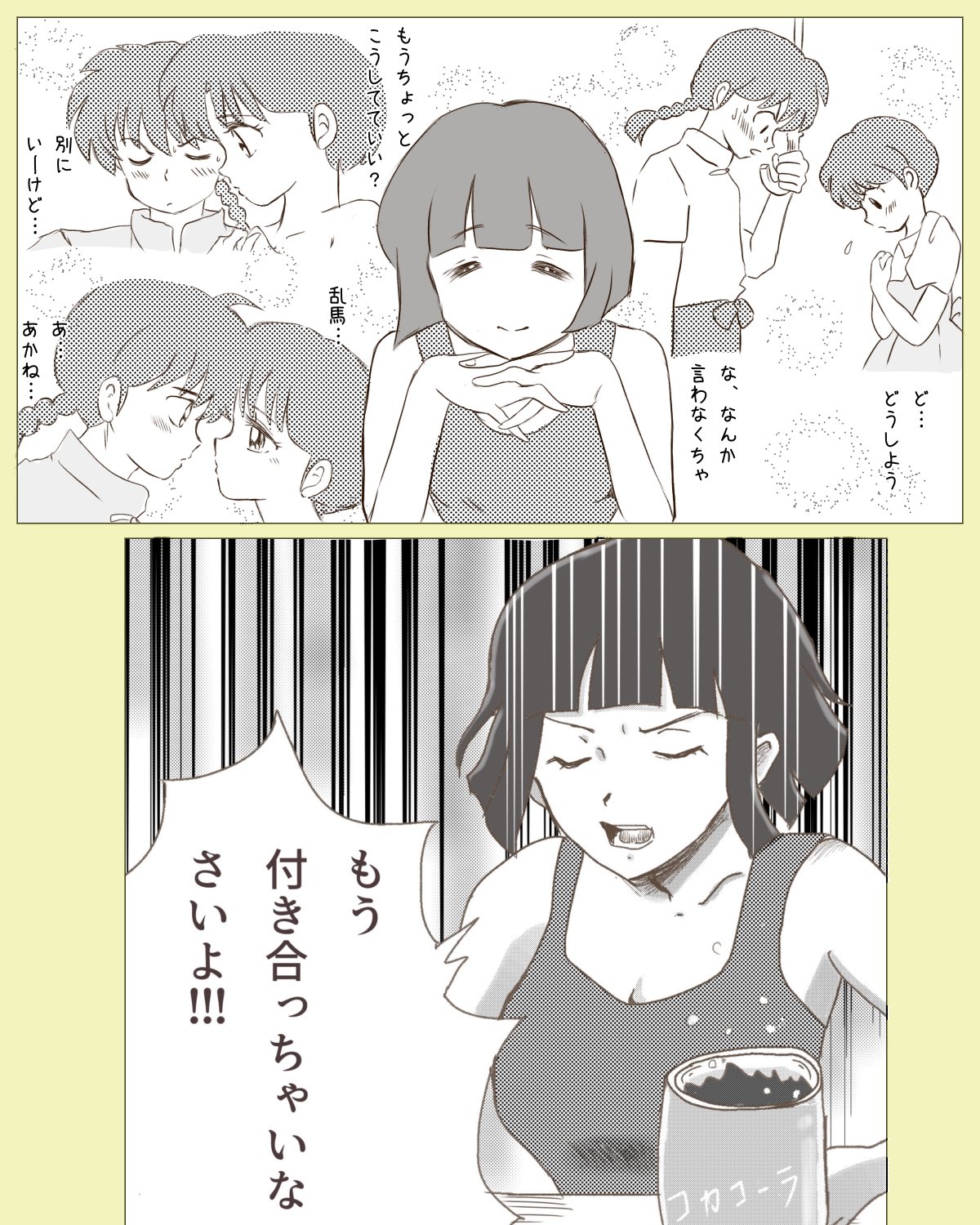 blush braid breasts cleavage closed_eyes closed_mouth collarbone greyscale_with_colored_background hetero highres open_mouth ranma_1/2 saotome_ranma short_hair siblings single_braid sisters smile sousou_no_frieren takotakoagare85 tendou_akane tendou_nabiki translation_request