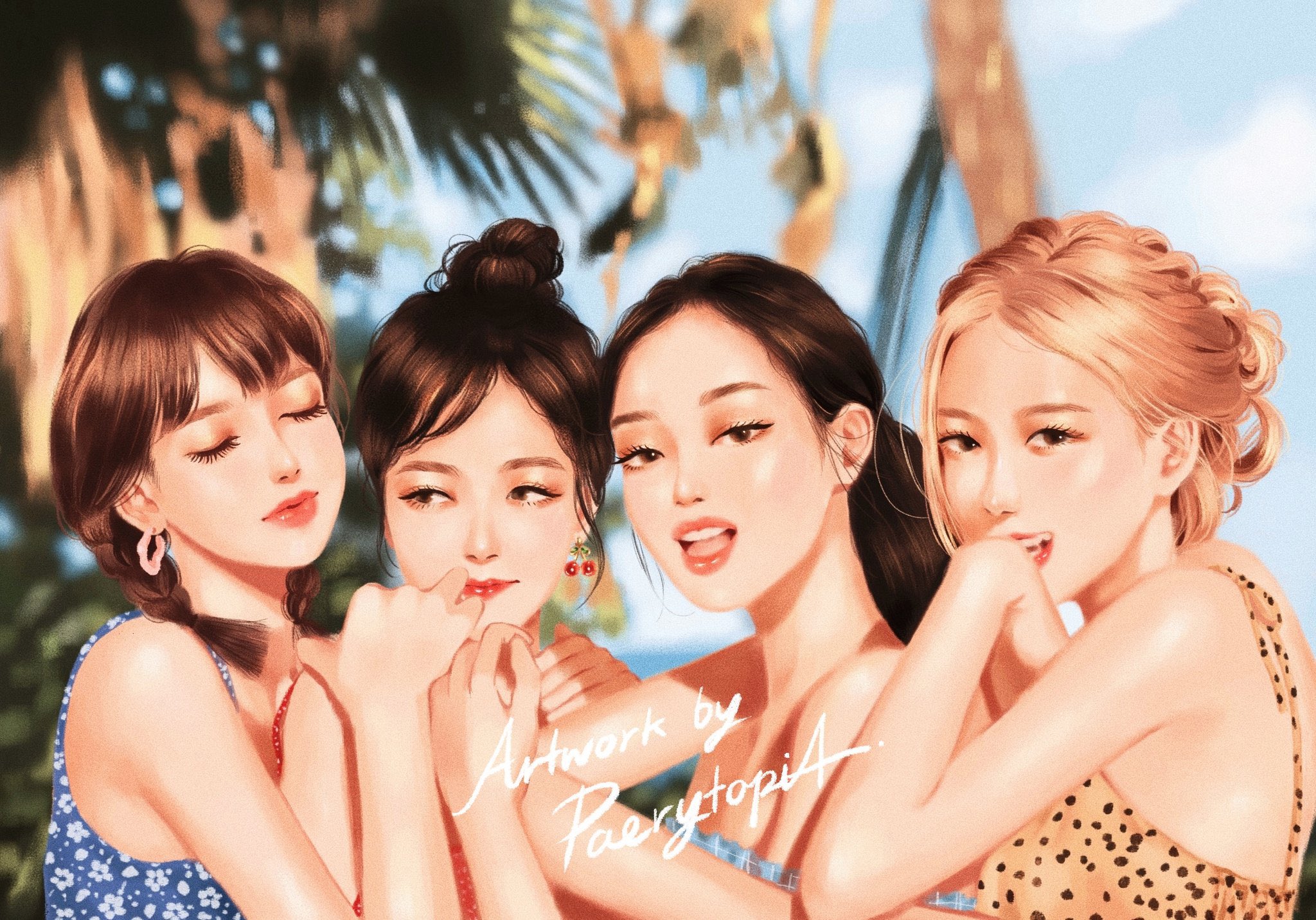 4girls artist_name blackpink blonde_hair braid braided_twintails brown_eyes brown_hair cherry_earrings closed_eyes commentary_request earrings eyeshadow food-themed_earrings food_themed_earrings hair_bun highres jennie_(blackpink) jewelry jisoo_(blackpink) lisa_(blackpink) makeup mascara multiple_girls open_mouth outdoors paerytopiaa ponytail real_life rose_(blackpink) smile thai_commentary upper_body