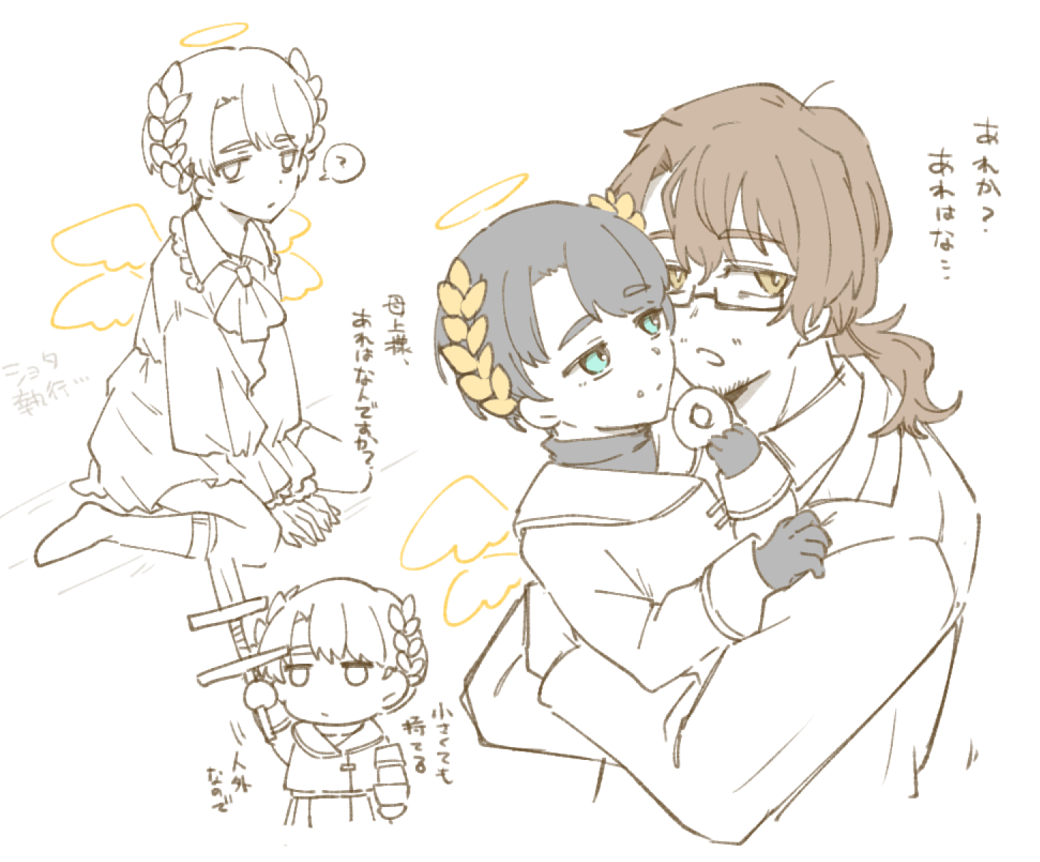 2boys ? absurdres aged_down ahoge alternate_costume angel_wings aqua_eyes arm_up armband ascot beard_stubble black_gloves black_hair black_sweater brooch brown_hair carrying carrying_person cheek-to-cheek child closed_mouth coat collared_shirt cropped_torso crossdressing crown donut dress dress_shirt dual_persona e.g.o_(project_moon) eating expressionless extra_wings eye_contact facial_hair feathered_wings food foot_out_of_frame formal_clothes four_wings frilled_dress frilled_shirt_collar frilled_sleeves frills from_side full_body garter_straps glasses gloves gown gregor_(project_moon) hair_intakes hair_ornament half-closed_eyes halo head_wreath heads_together highres holding holding_donut holding_food holding_sword holding_weapon hug jewelry jitome lapels laurel_crown laurels lily26983455 limbus_company limited_palette long_hair long_sleeves looking_ahead looking_at_another looking_at_viewer looking_to_the_side low_ponytail male_focus meursault_(project_moon) mini_wings motion_lines multiple_boys multiple_persona multiple_views multiple_wings necktie official_alternate_costume open_clothes open_coat open_mouth parted_bangs partially_colored ponytail project_moon puffy_long_sleeves puffy_sleeves pursuance_(e.g.o) quilted_clothes semi-rimless_eyewear shirt short_hair shorts simple_background sitting socks spoken_question_mark spot_color standing stubble suit sweater sword turtleneck turtleneck_sweater under-rim_eyewear upper_body v_arms vest wariza weapon white_background white_coat white_wings wings yaoi yellow_eyes zwei_association_south_uniform