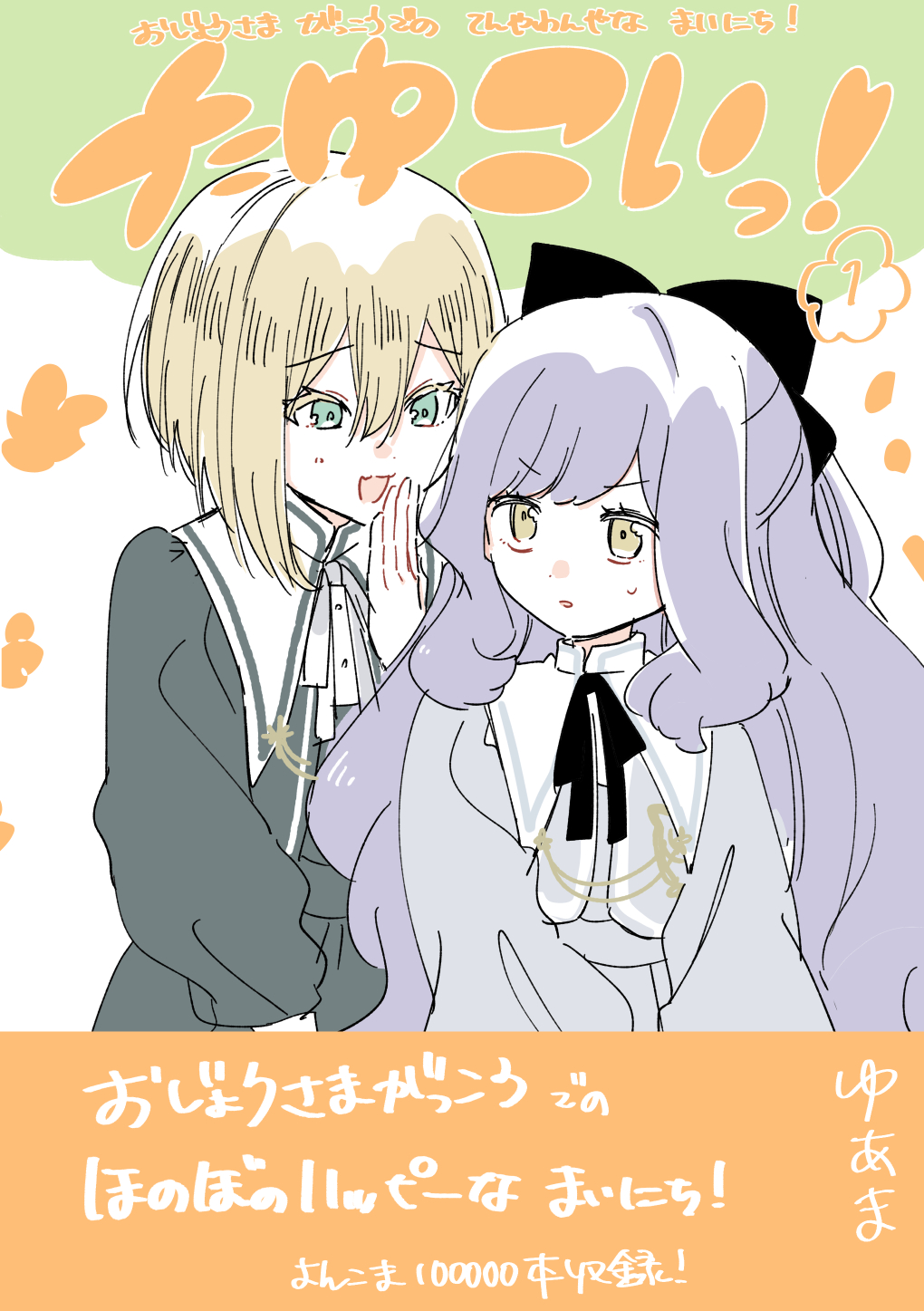 2girls :3 blonde_hair blue_hair bob_cut bow commentary_request emma_grace_rosenthal grey_shirt hair_bow hand_up highres inverted_bob jougasaki_suzuran long_hair long_sleeves multiple_girls open_mouth shirt tayutau_koi_no_chirigiwa_ni yellow_eyes yuama