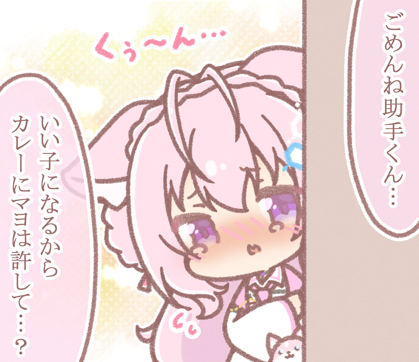 1girl animal_ear_fluff animal_ears antenna_hair blush braid chibi collared_shirt commentary_request crown_braid ears_down hair_between_eyes hakui_koyori hakui_koyori_(1st_costume) highres hololive jacket kokoro_(hakui_koyori) long_hair long_sleeves mitarashi_neko necktie nose_blush peeking_out pink_hair pink_necktie purple_eyes shirt translation_request very_long_hair virtual_youtuber white_jacket white_shirt wide_sleeves