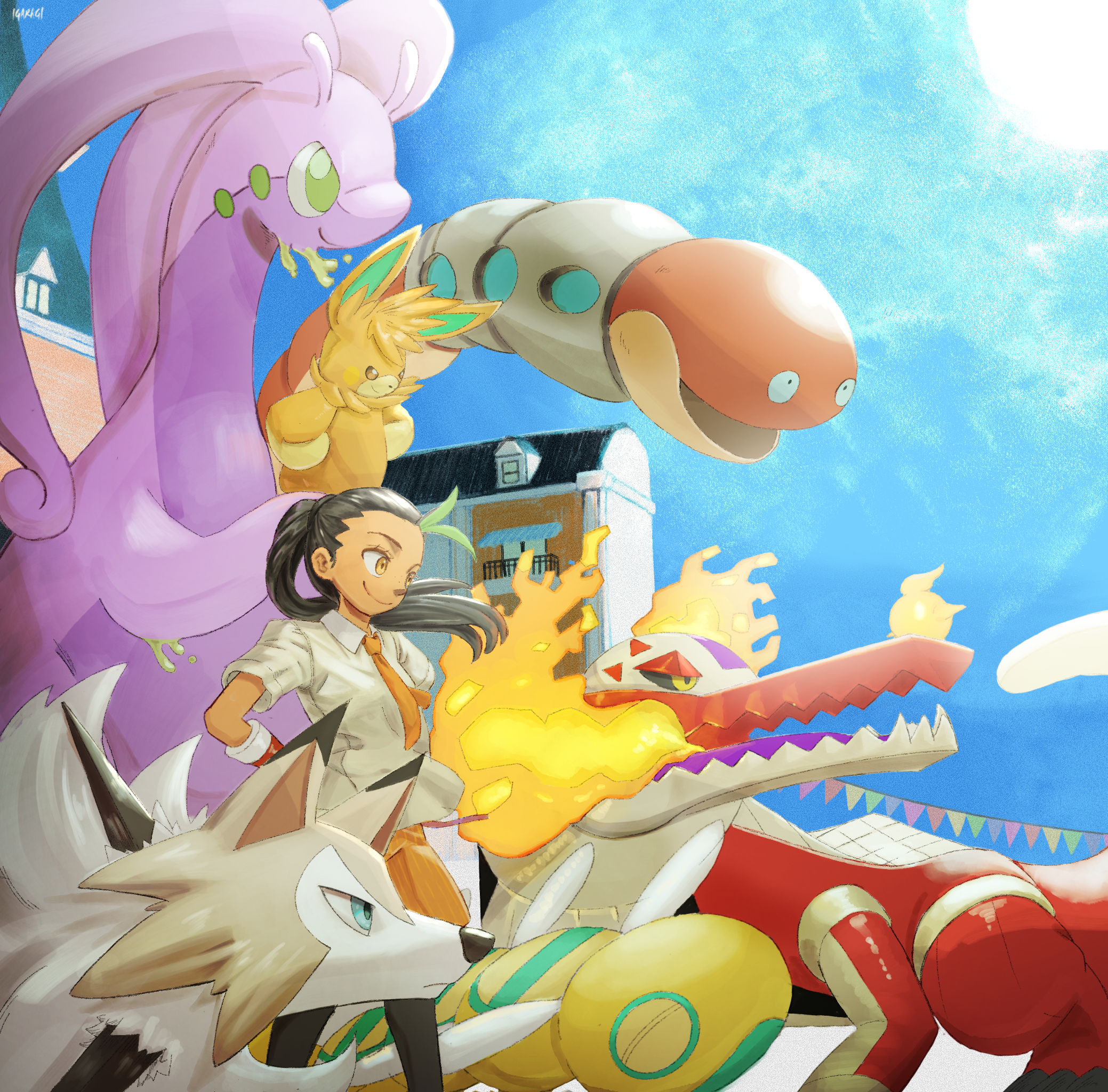 1girl black_hair black_pantyhose black_sclera blue_eyes blue_sky building closed_mouth collared_shirt colored_sclera commentary_request dark-skinned_female dark_skin day dudunsparce dudunsparce_(three-segment) eyelashes fire fire_bird_(skeledirge) freckles gen_6_pokemon gen_7_pokemon goodra green_eyes green_hair highres igaragi long_hair lycanroc lycanroc_(midday) multicolored_hair naranja_academy_school_uniform necktie nemona_(pokemon) nintendo open_mouth orange_eyes orange_necktie orange_shorts orthworm outdoors pantyhose pawmot pokemon pokemon_(creature) pokemon_scarlet_and_violet pokemon_team ponytail school_uniform shirt short_sleeves shorts skeledirge sky slime_(substance) smile string_of_flags two-tone_hair white_shirt yellow_eyes