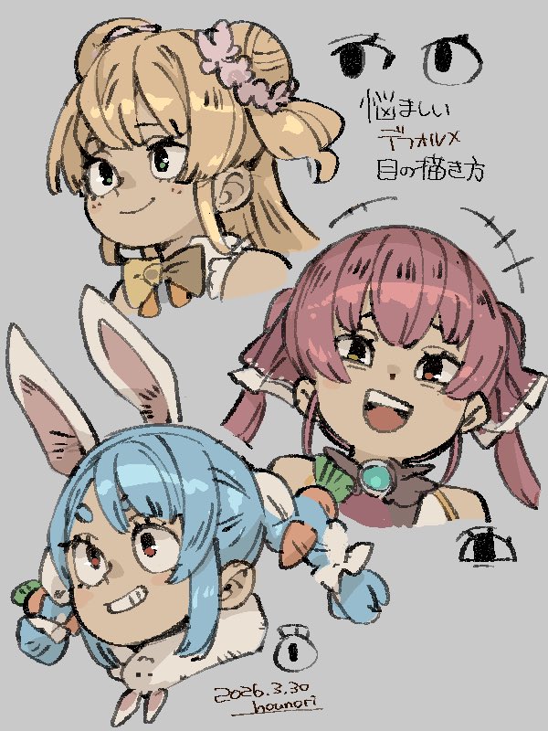 +++ 3girls animal_ears bare_shoulders blonde_hair blue_hair blush_stickers bow bowtie braid braided_twintails commentary_request cropped_torso dated don-chan_(usada_pekora) double_bun flower green_eyes grey_background hair_bun hair_flower hair_ornament hair_ribbon heterochromia hololive hounori houshou_marine houshou_marine_(1st_costume) momosuzu_nene momosuzu_nene_(1st_costume) multiple_girls portrait rabbit_ears rabbit_girl red_eyes red_hair ribbon sidelocks smile translation_request twintails usada_pekora usada_pekora_(1st_costume) virtual_youtuber yellow_bow yellow_bowtie