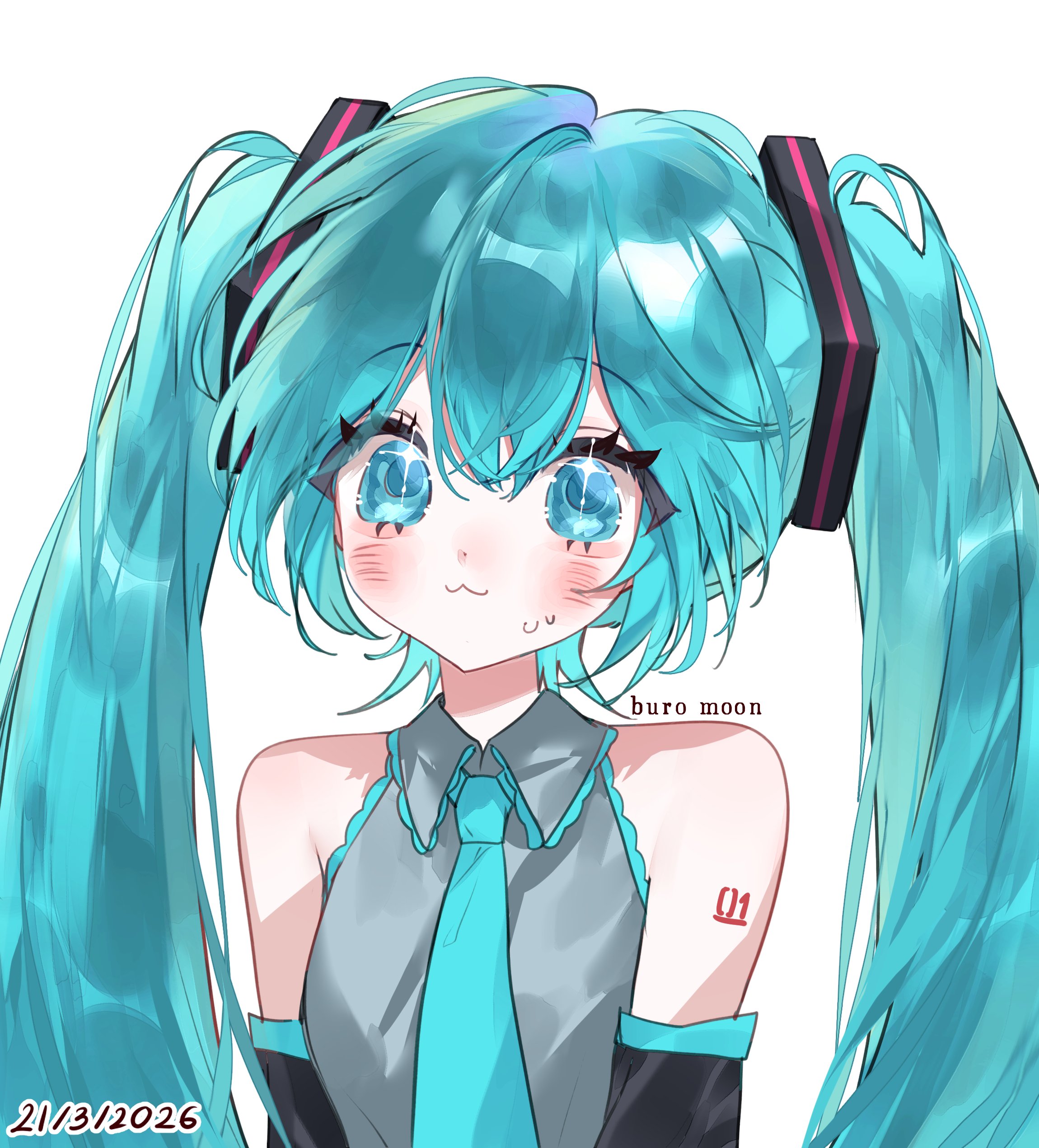1girl :3 absurdres arm_tattoo blue_eyes blue_hair buro_moon commentary hatsune_miku highres long_hair looking_at_another necktie simple_background solo tattoo twintails untranslatable_commentary vocaloid white_background