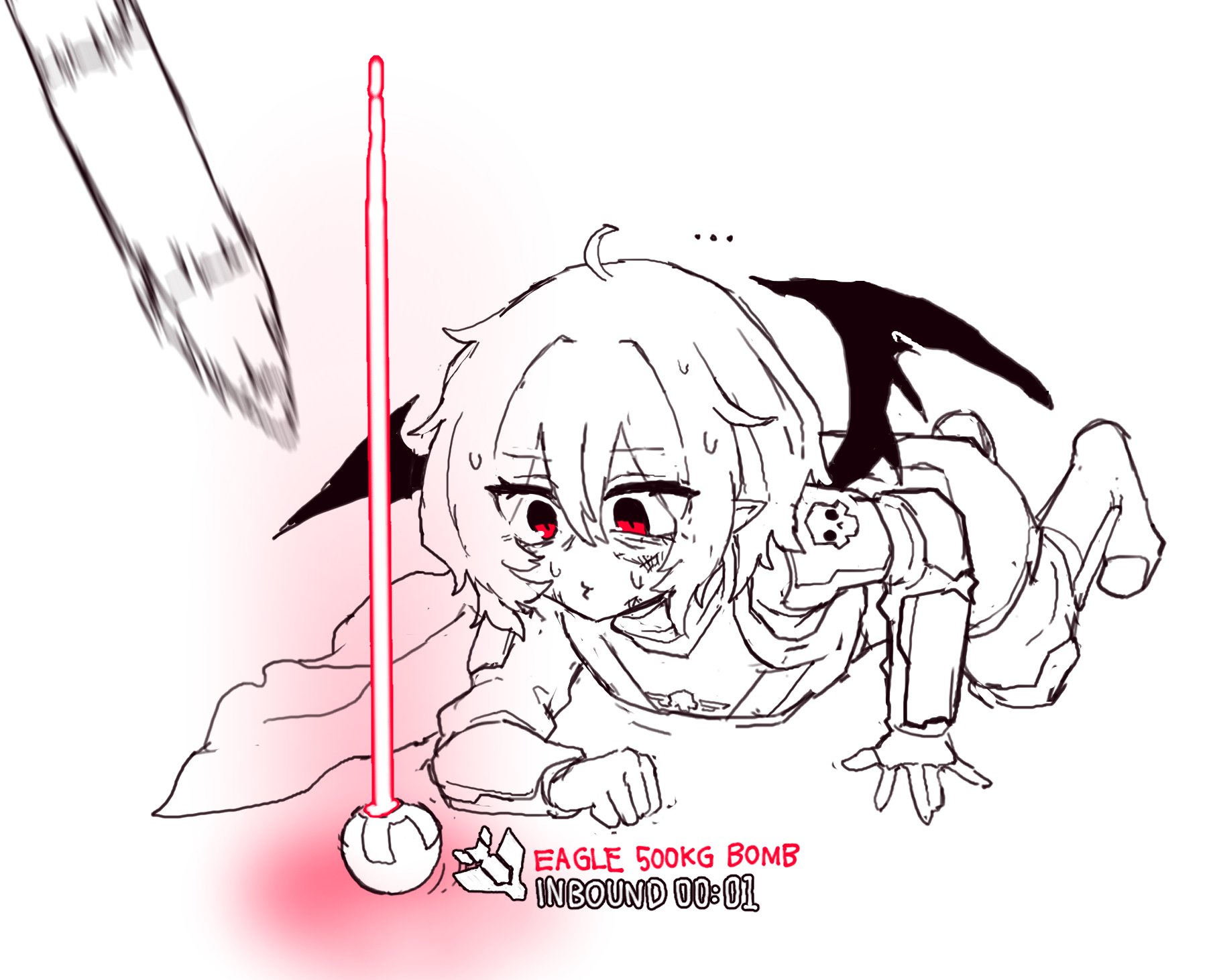 ... 1girl alternate_costume armor bat_wings boots cape eagle_500kg_bomb_stratagem_(helldivers) english_text gloves hair_between_eyes helldivers_(series) highres impending_doom laser lying medium_hair missile missing_headwear on_stomach pointy_ears rampa93 red_eyes remilia_scarlet scratches skull_print solo spot_color stratagem_(helldivers) sweat touhou wings