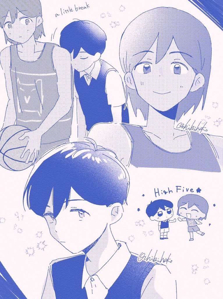 2boys antenna_hair ball basketball_(object) blue_theme closed_eyes closed_mouth commentary dark-skinned_male dark_skin double-parted_bangs english_text hair_between_eyes hibi_hako holding holding_ball kel_(faraway)_(omori) kel_(omori) looking_at_another looking_at_viewer male_focus monochrome multiple_boys omori open_mouth short_hair smile sunny_(omori) yaoi