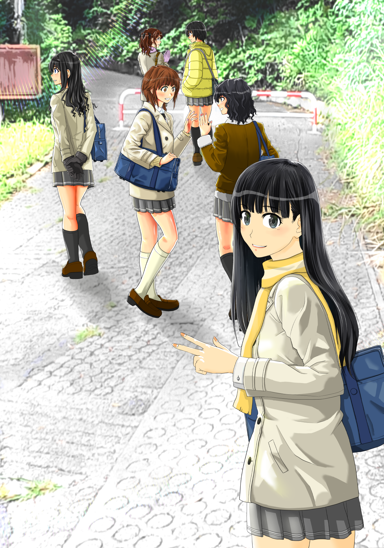 6+girls amagami arms_behind_back ayatsuji_tsukasa backpack bag black_bow black_eyes black_gloves black_hair black_socks blue_eyes blunt_bangs blush bow brown_eyes brown_hair brown_jacket coat collared_shirt commentary_request day gloves grey_coat heel_up highres jacket kankon_(idou_toshokan) kneehighs kneepits light_blush loafers long_hair long_sleeves looking_at_viewer miniskirt mittens morishima_haruka multiple_girls nakata_sae nanasaki_ai open_mouth outdoors pink_mittens pleated_skirt road sakurai_rihoko scarf school_bag school_uniform shirt shoes short_hair skirt smile socks standing straight_hair tanamachi_kaoru teeth translation_request tree upper_teeth_only v walking wavy_hair white_socks wing_collar winter_clothes yellow_jacket yellow_scarf