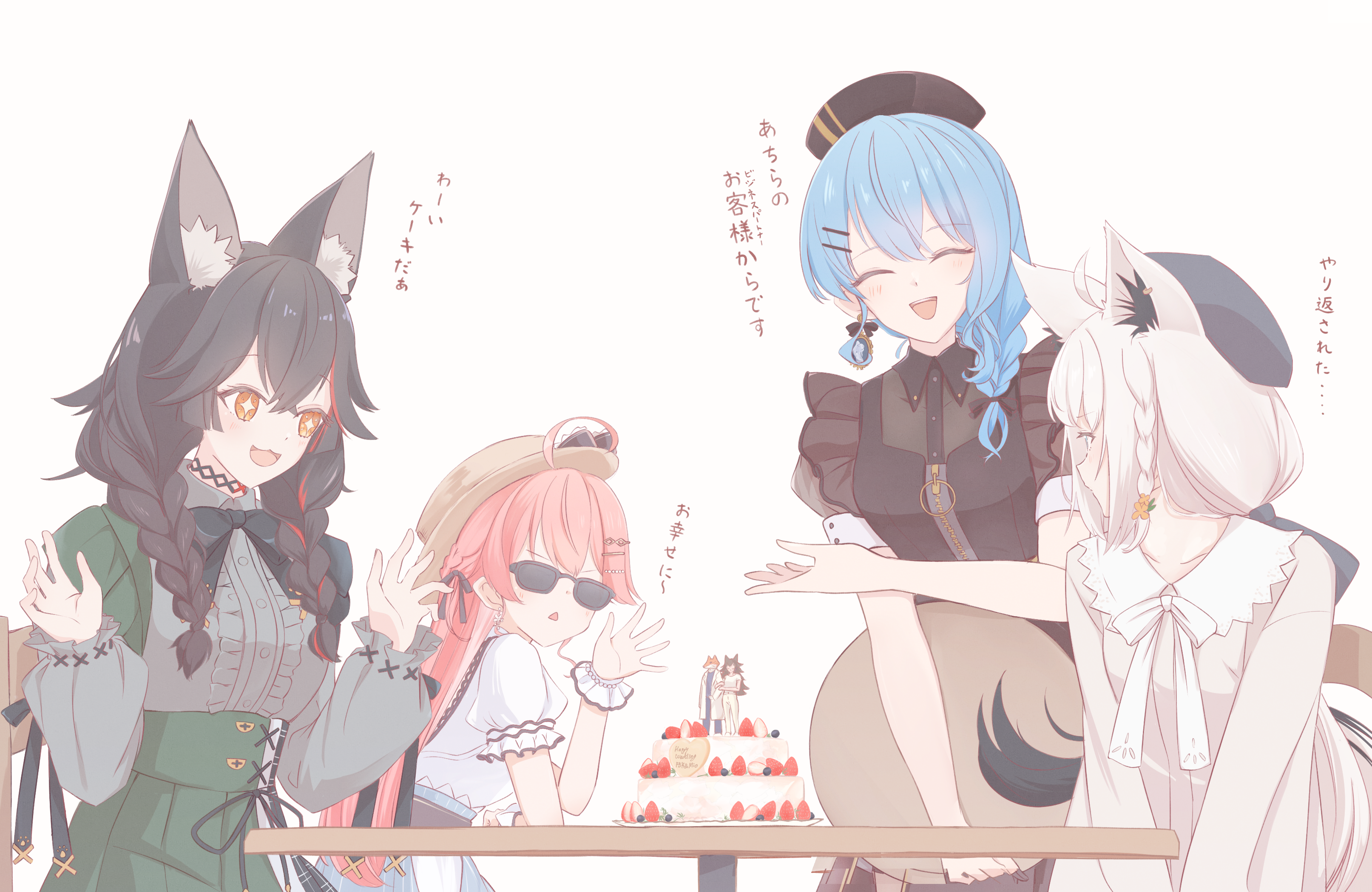 +_+ 4girls absurdres ahoge animal_ear_fluff animal_ear_piercing animal_ears beret black_dress black_hair black_hat black_headdress black_ribbon blue_hair blue_skirt bow bowtie braid braided_twintails brown_shirt cake capelet center_frills chamomile_(kazumasa) closed_eyes collared_dress commentary_request double-parted_bangs dress food fox_ears fox_girl fox_tail frills green_capelet green_skirt grey_hair hair_ornament hair_ribbon hairclip hat high-waist_skirt highres hololive hololive_grand_theft_auto hoshimachi_suisei hoshimachi_suisei_(maid) long_hair long_sleeves looking_at_food low_ponytail low_twin_braids maid medium_hair multicolored_hair multiple_girls nurse_cap official_alternate_costume official_alternate_hairstyle ookami_mio ookami_mio_(8th_costume) overskirt pink_hair ponytail puffy_short_sleeves puffy_sleeves red_streaks ribbon sakura_miko sakura_miko_(street) see-through_clothes see-through_sleeves shirakami_fubuki shirakami_fubuki_(street) shirt short_sleeves side_braid skirt sleeve_cuffs straw_hat streaked_hair sunglasses tail translation_request twin_braids virtual_youtuber wedding_cake white_bow white_bowtie white_shirt wolf_ears yellow_eyes zipper_dress