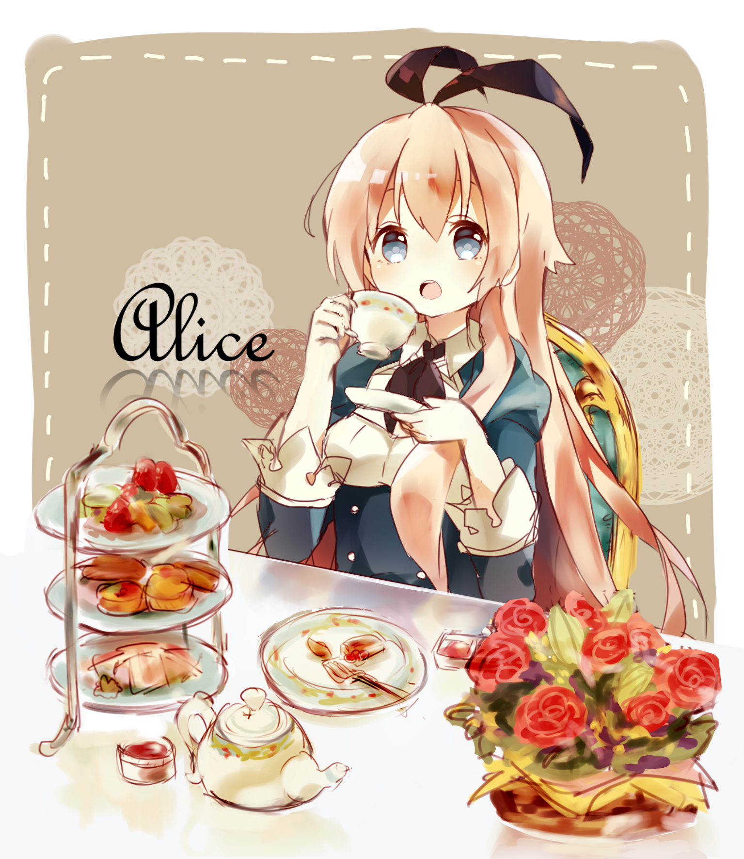 1girl alice_(grimms_notes) alice_(original)_(grimms_notes) az_9649 blonde_hair blue_eyes buttons character_name commentary_request cup flower grimms_notes hair_between_eyes hands_up highres holding holding_cup juliet_sleeves long_hair long_sleeves looking_at_viewer open_mouth plate puffy_sleeves red_flower red_rose rose sitting solo teacup teeth tiered_tray upper_teeth_only