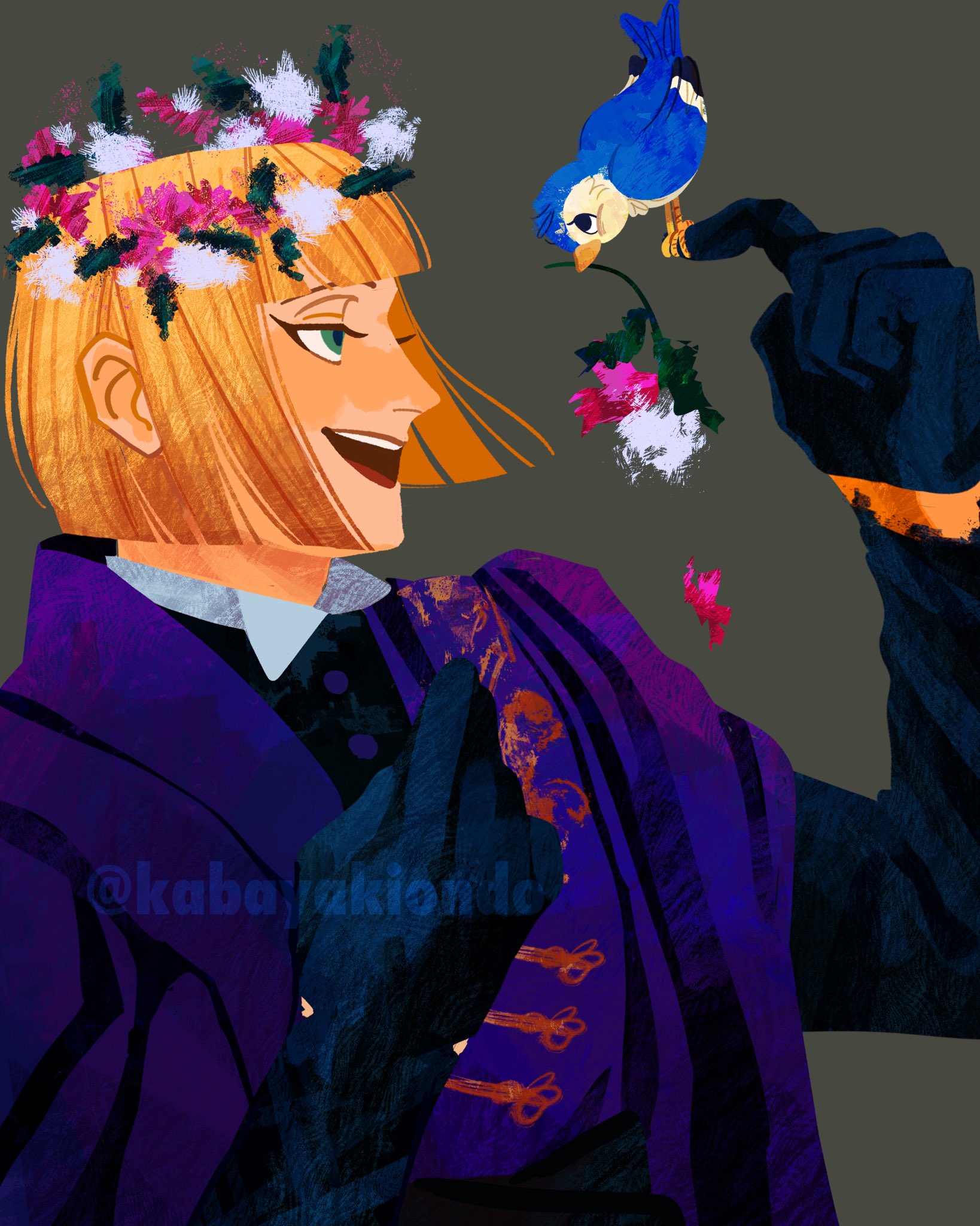 1boy 1other artist_name bird bird_wings black_gloves blonde_hair blue_bird bob_cut commentary flower gloves green_eyes grey_background hand_up hat_feather head_wreath highres humming kabayakiondo long_sleeves male_focus multiple_boys music open_mouth petals pink_flower pomefiore_dorm_uniform purple_robe robe rook_hunt short_hair simple_background singing solo twisted_wonderland twitter_username untranslatable_commentary white_flower wings