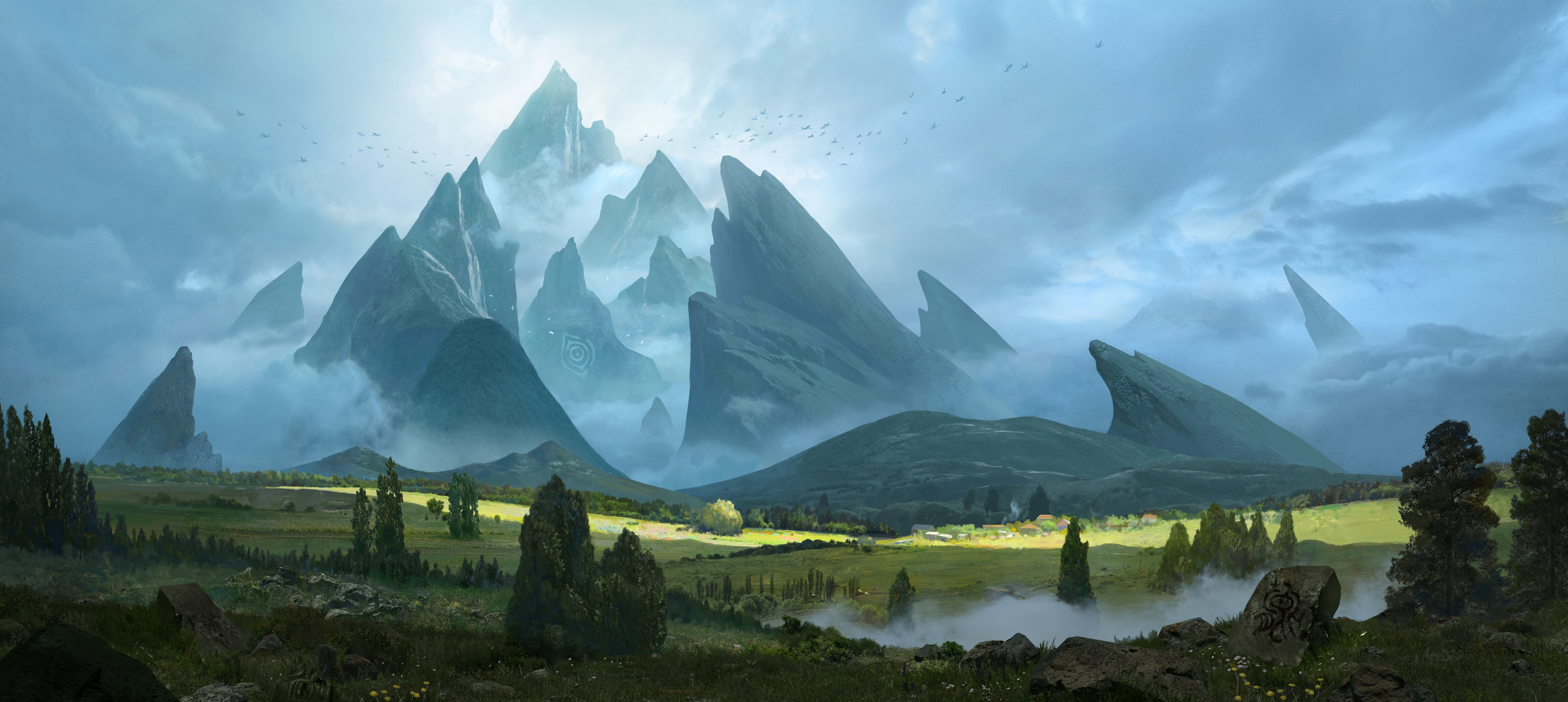 absurdres blue_sky bush chinese_commentary cloud cloudy_sky commentary_request day field flock fog grass highres landscape mountain original outdoors painterly rock runes scenery sky sunlight town tree zhongjusun