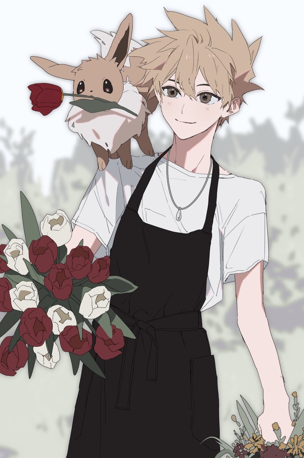 1boy alternate_costume apron black_apron blue_oak bouquet brown_eyes brown_hair closed_mouth eevee flower gen_1_pokemon hair_between_eyes highres jewelry male_focus necklace nintendo on_shoulder pokemon pokemon_(creature) pokemon_on_shoulder pokemon_red/green/blue/yellow red_flower sekaiitinoki shirt short_hair short_sleeves smile white_flower white_shirt