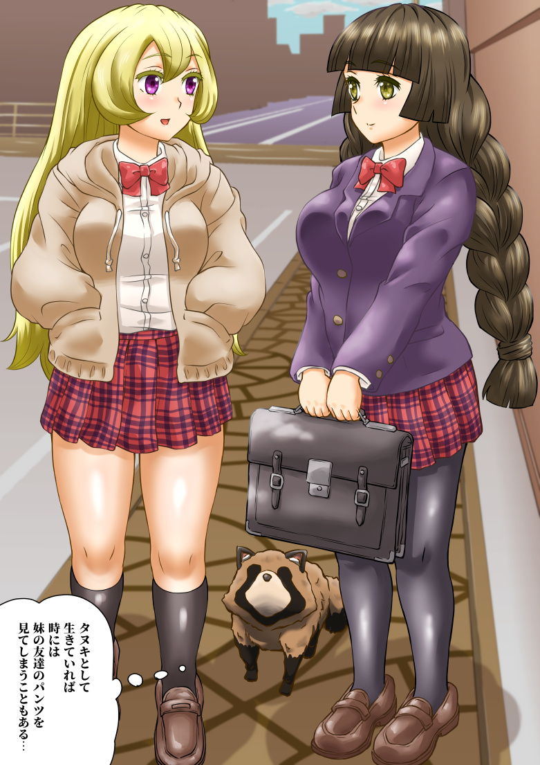 2girls :d animal bag black_pantyhose black_socks blunt_bangs bob_cut bow bowtie braid braided_twintails breasts brown_jacket character_request closed_mouth commentary_request copyright_request double-parted_bangs full_body hair_between_eyes hands_in_pockets holding holding_bag jacket large_breasts loafers multiple_girls open_mouth outdoors pantyhose plaid_clothes plaid_skirt purple_eyes purple_jacket red_bow red_bowtie red_skirt road school_bag shirt shoes skirt smile socks standing street tanuki translation_request wasabi_shoujo white_shirt yellow_eyes