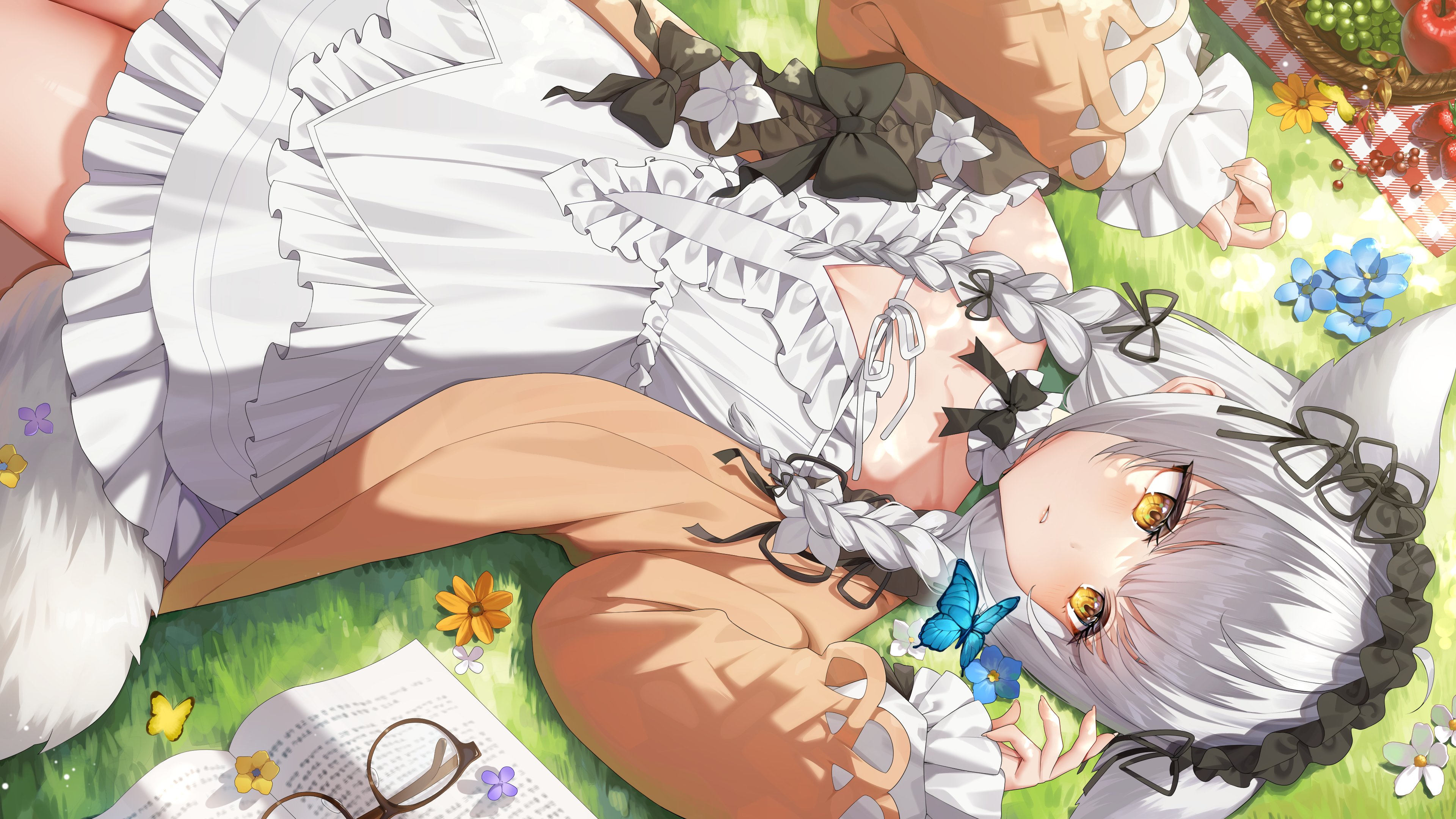1girl absurdres animal_ears apple black_bow black_bowtie blue_butterfly book bow bowtie braid bug butterfly dress flower food frilled_dress frills fruit glasses grapes grass highres indie_virtual_youtuber insect long_hair lying sofieru sofieru_(artist) tail twin_braids white_flower white_hair yellow_eyes