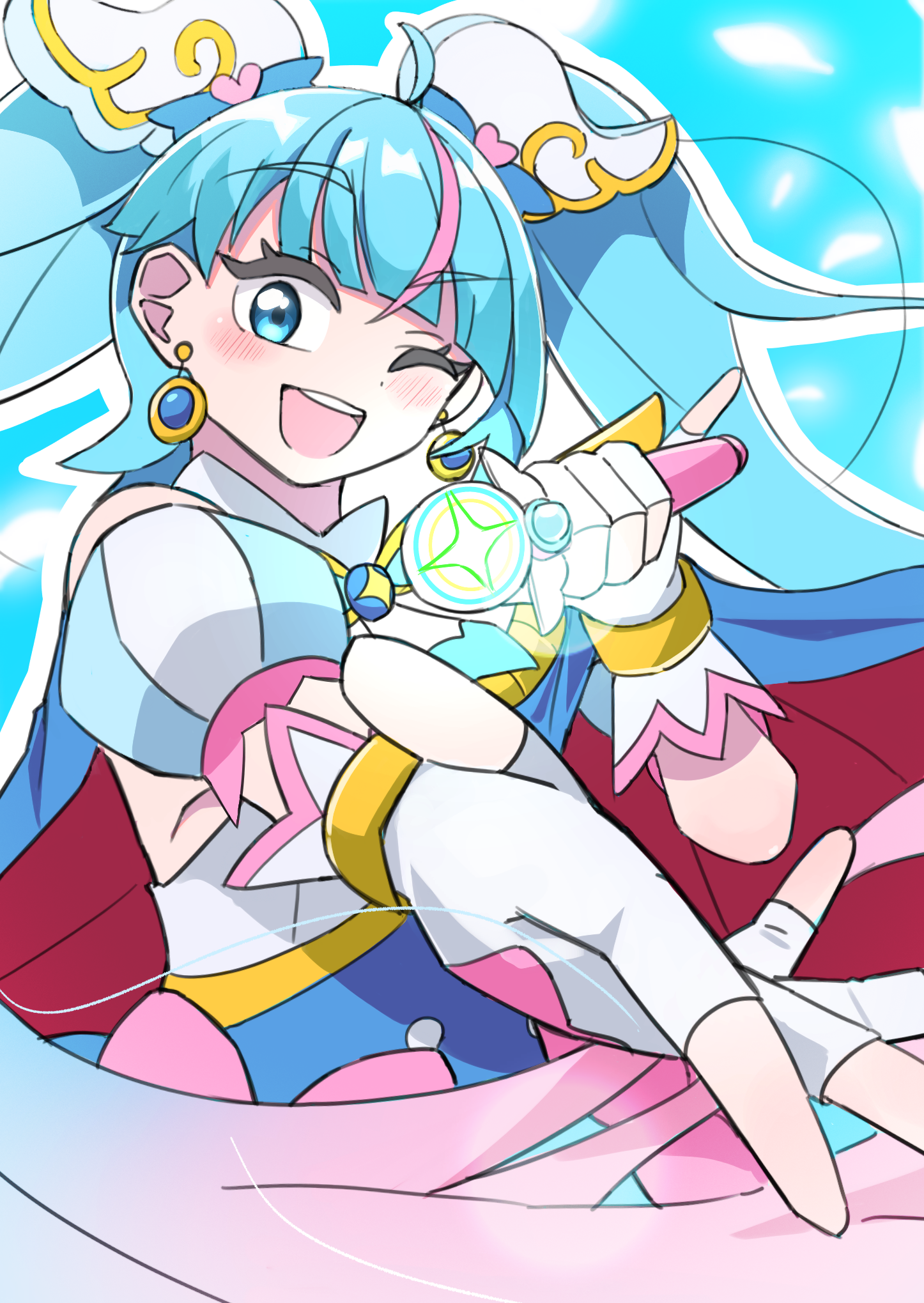 1girl ;d ahoge asymmetrical_bangs blue_background blue_bow blue_cape blue_dress blue_eyes blue_hair blue_theme bow brooch cape commentary cure_sky cut_bangs detached_sleeves diagonal_bangs dress dress_bow earrings feathers fingerless_gloves gloves glowing glowing_feather gradient_hair hair_between_eyes hair_bow hair_ornament highres hirogaru_sky!_precure holding jewelry long_hair looking_at_viewer magical_girl medium_dress multicolored_hair nuuji_nuge one_eye_closed open_hand open_mouth outline outstretched_arm outstretched_hand pink_bow pink_hair pinky_out precure puffy_detached_sleeves puffy_sleeves raised_eyebrow reaching reaching_towards_viewer red_cape simple_background single_bare_shoulder single_hair_streak single_sidelock sky_mirage sleeveless sleeveless_dress smile solo sora_harewataru sphere_earrings spread_fingers streaked_hair teeth twintails two-sided_cape two-sided_fabric two-tone_dress two-tone_hair upper_body upper_teeth_only very_long_hair white_dress white_feathers white_gloves white_outline wing_brooch wing_hair_ornament